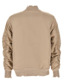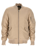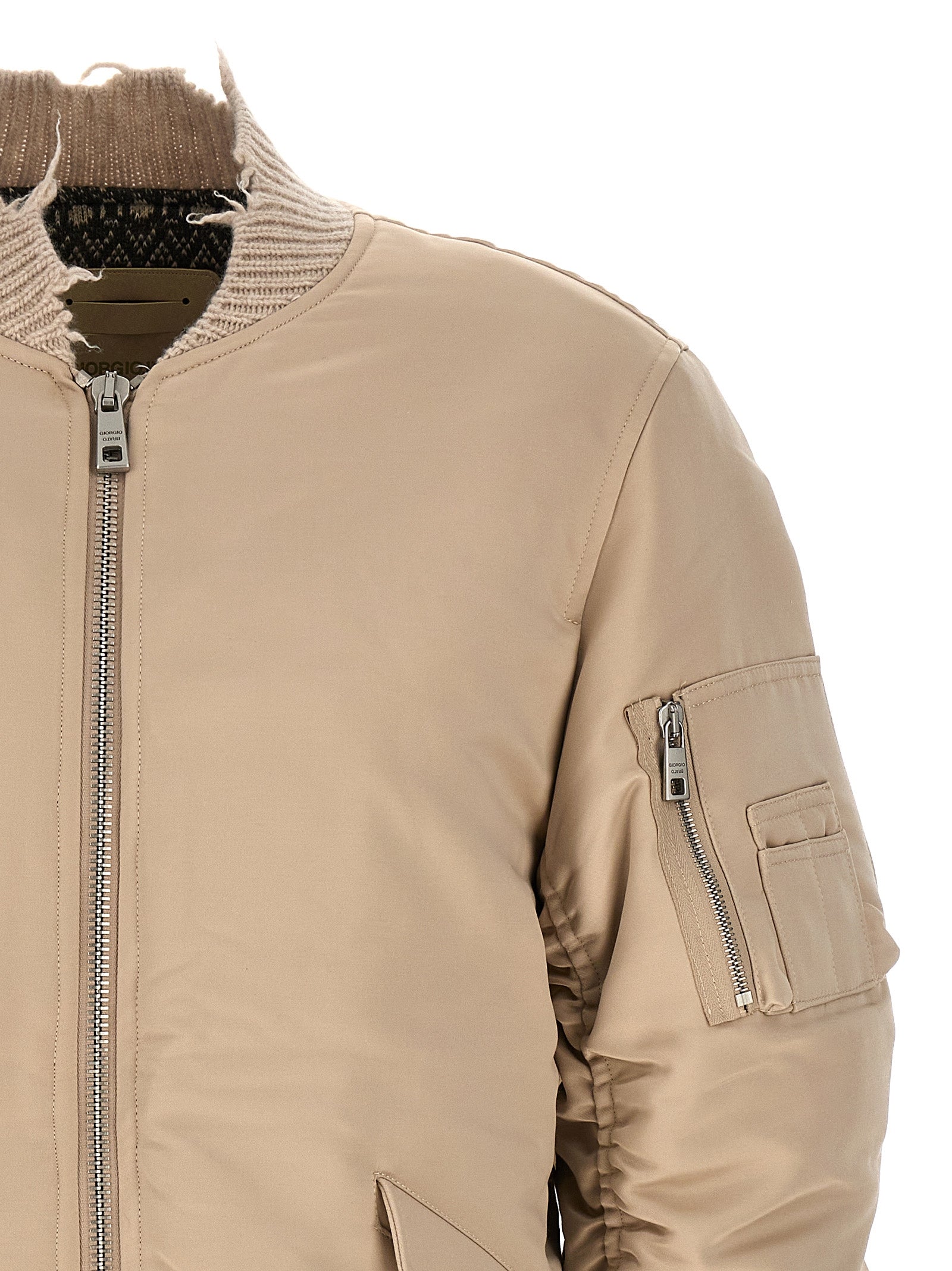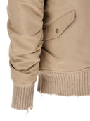 Satin bomber jacket, wool-lined interior, zip closure, pockets, long sleeves with knitted cuffs, and used-effect details.