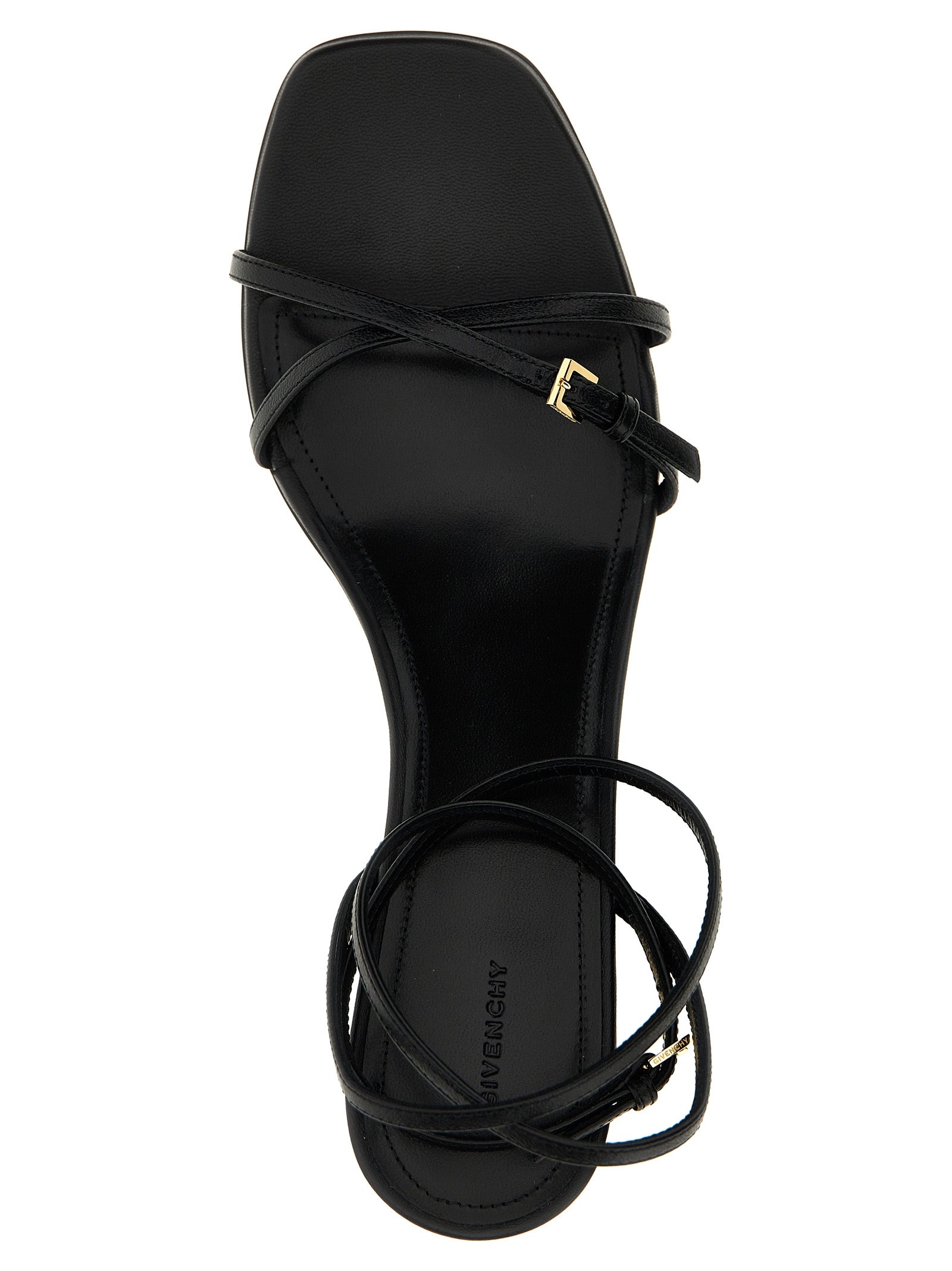 'G Cube' calf leather sandals with crossed ankle straps with metal buckle. 'G cube' square sculpted heel.