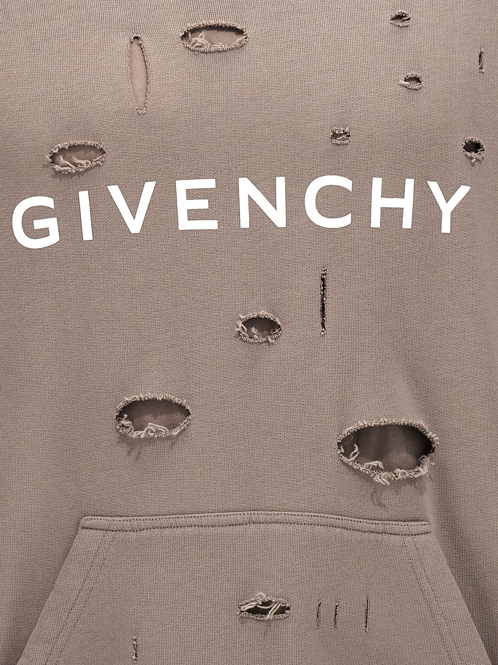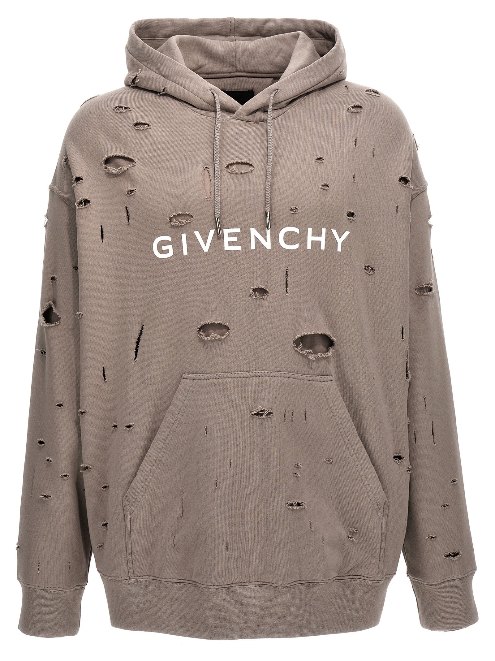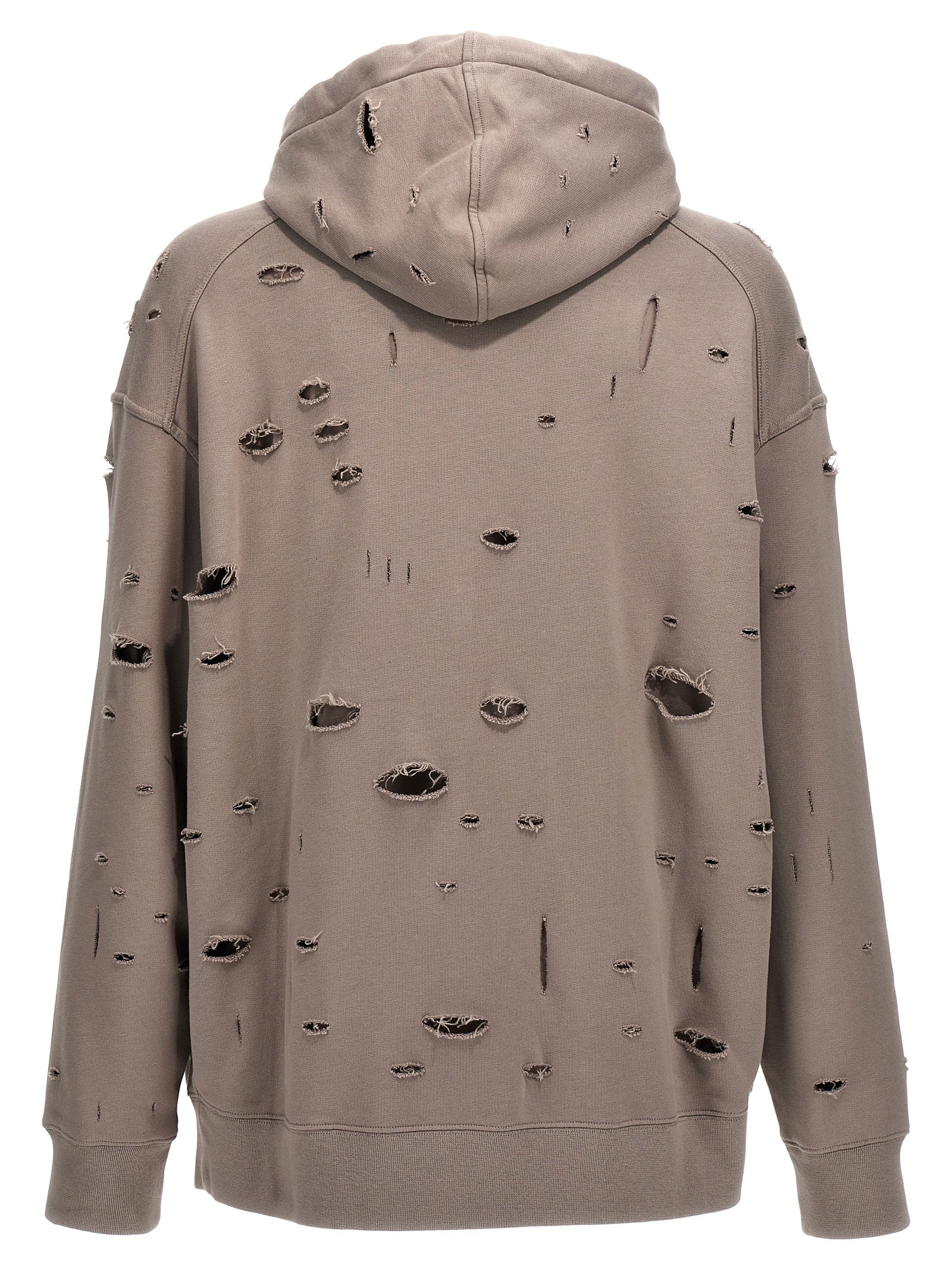 Cotton hoodie with all-over rips, kangaroo pocket, logo print. The color is a gray tending to purple.