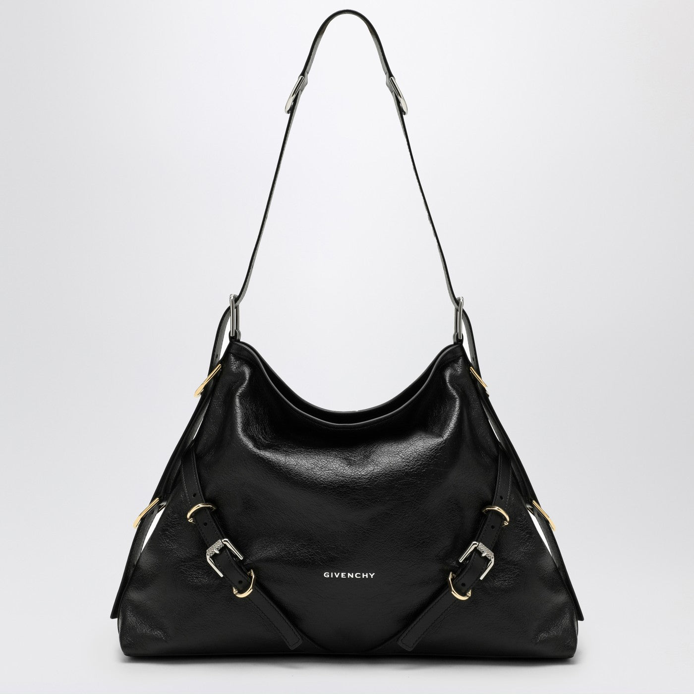 Medium shoulder bag by Givenchy in black leather, featuring adjustable shoulder, gold and silver metal buckles and rings, metal lettering logo on the front, one main compartment and one zipped inner pocket.