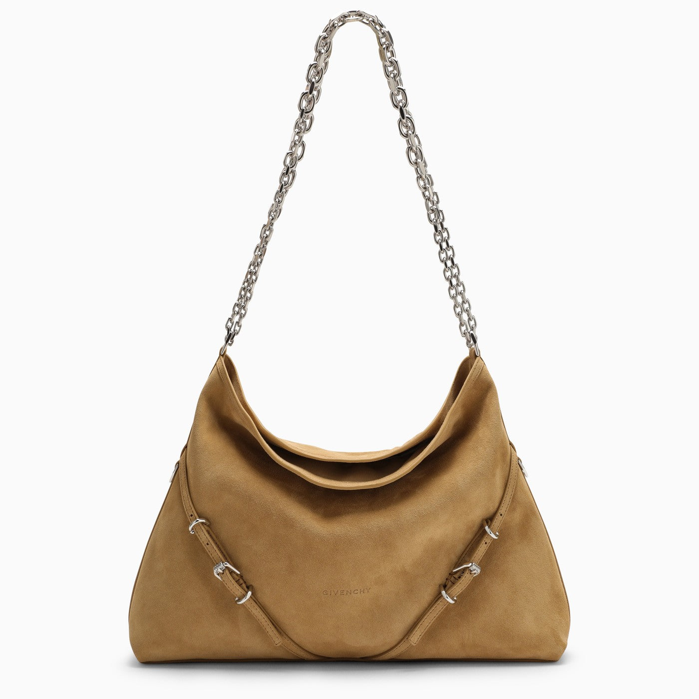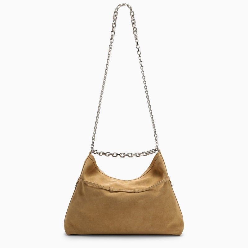 Medium shoulder bag by Givenchy in hazel-coloured suede featuring silver-tone chain shoulder, silver metal buckles and rings, lettering logo on the front, one main compartment and one zipped inner pocket.