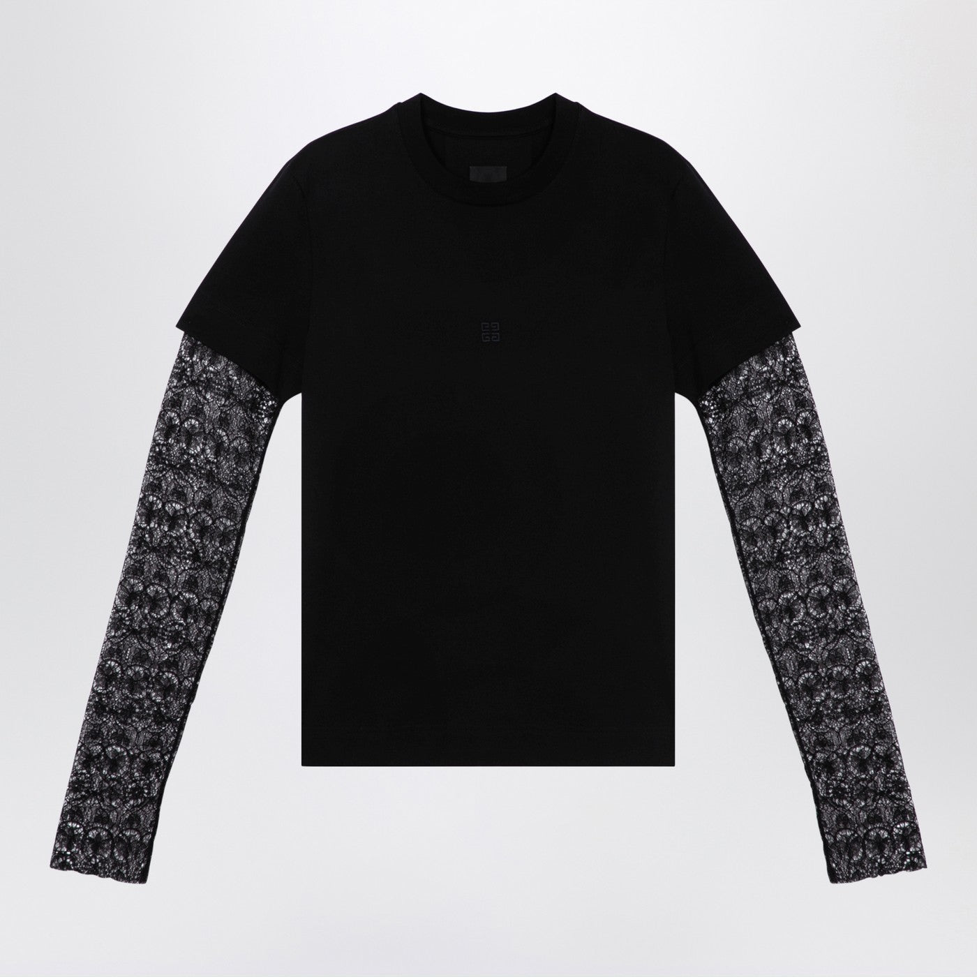 Crew-neck T-shirt in black cotton by Givenchy, featuring an overlapping design with long sleeves in cotton and lace with 4G detailing, a small embroidered logo on the tone-on-tone front and a slim fit.