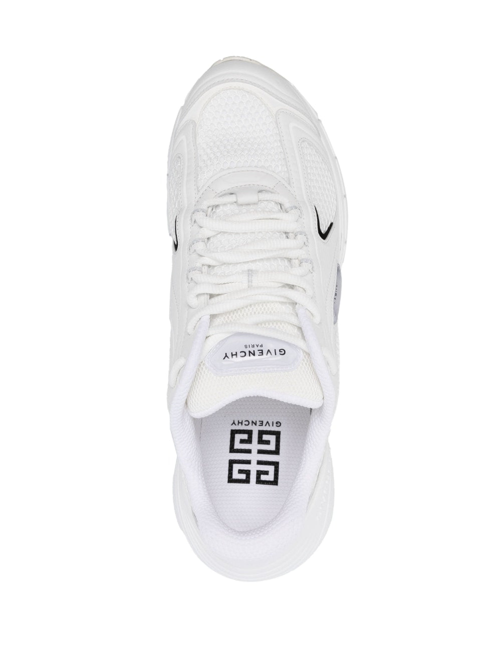 TK-MX mesh low-top sneakers from Givenchy featuring optical white, jet black, faux leather, signature 4G motif, reflective detailing, mesh panelling, logo patch at the tongue, round toe, mid sculpted heel, front lace-up fastening and rubber sole.