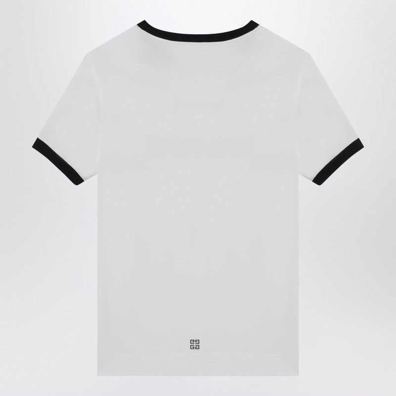 White cotton Givenchy crewneck T-shirt featuring short sleeves, contrasting lettering logo on chest, back logo, contrasting black piping and slim fit.