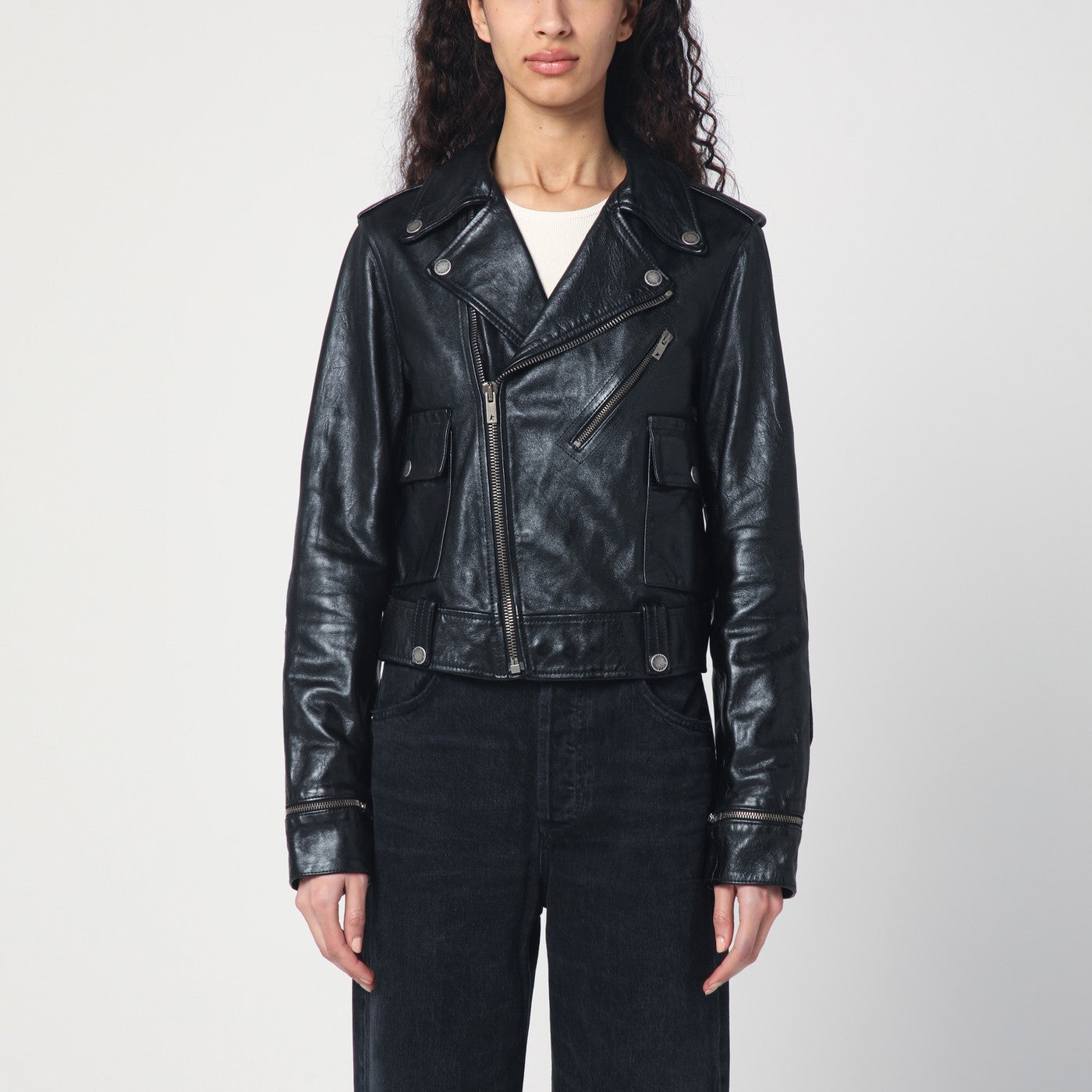Golden Goose Deluxe Brand black leather jacket with a glossy effect, featuring long sleeves with zip cuffs, front zip closure, two flap pockets with buttons on the front, one zip pocket on the chest, logo stars on the back, and a back slit with a zip.