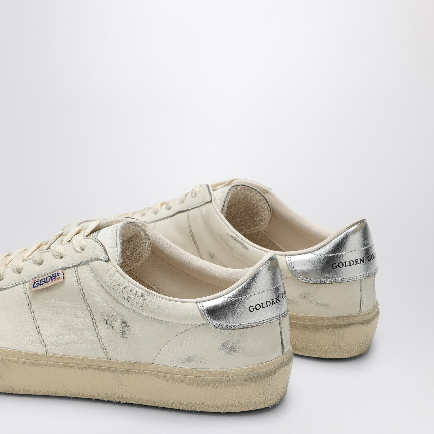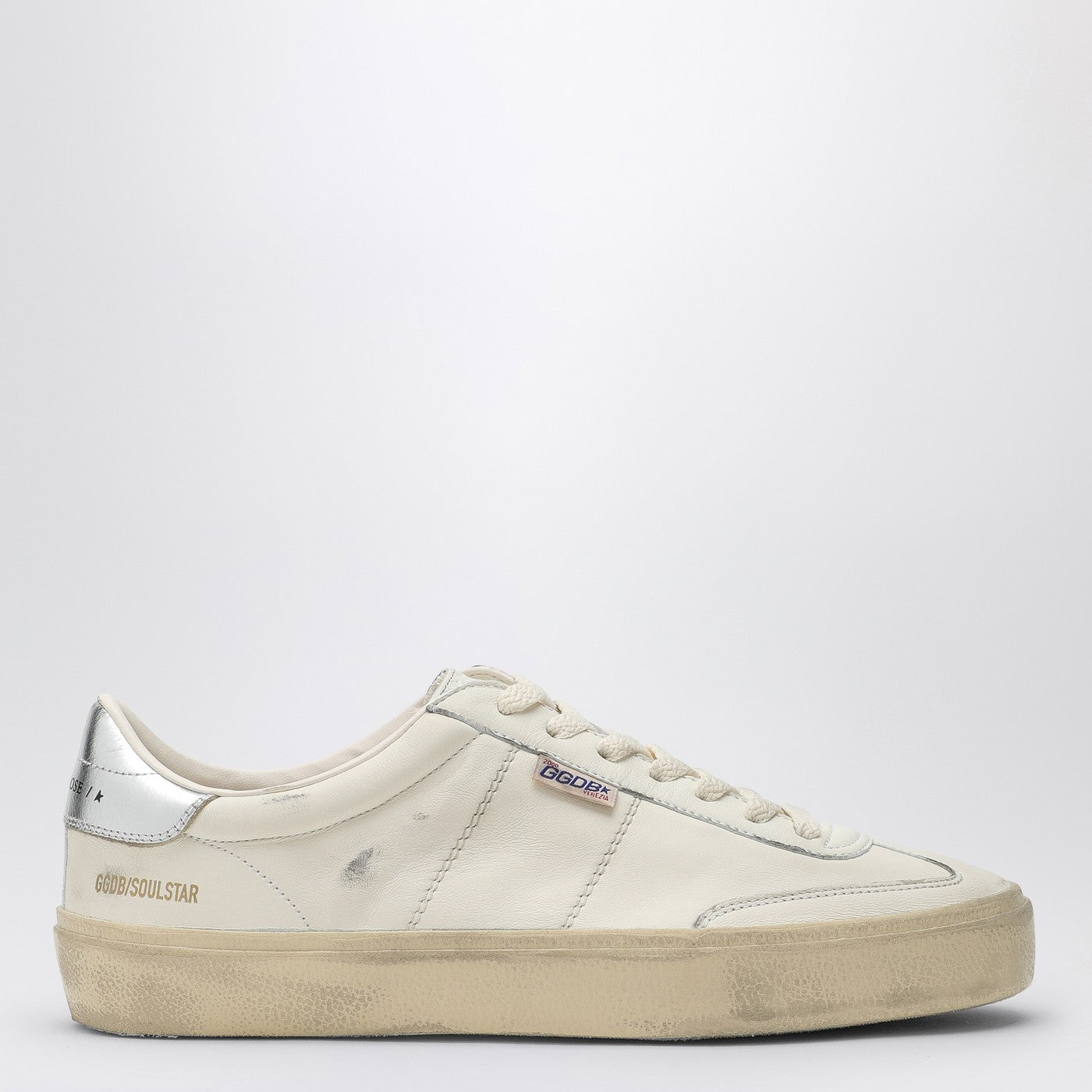 White leather low top trainer from Golden Goose Deluxe Brand featuring a round toe, a lace-up fastening, a contrasting silver-tone heel, a branded tongue and a rubber sole. Model with vintage effect processing.