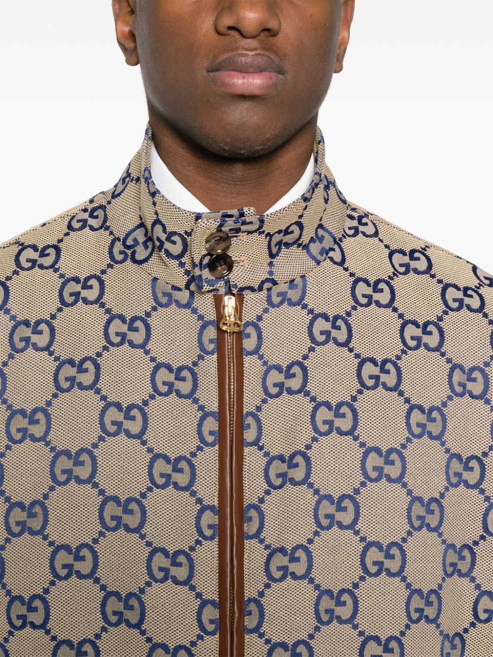 beige/blue/brown cotton blend classic GG canvas leather trim buttoned stand-up collar long sleeves two side flap pockets straight hem front zip fastening