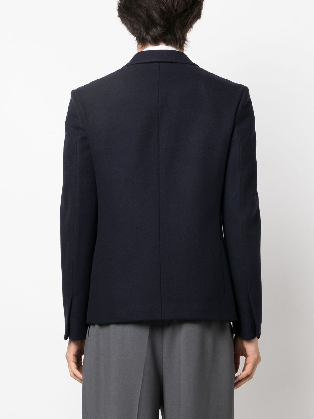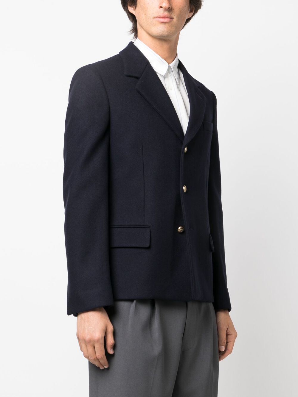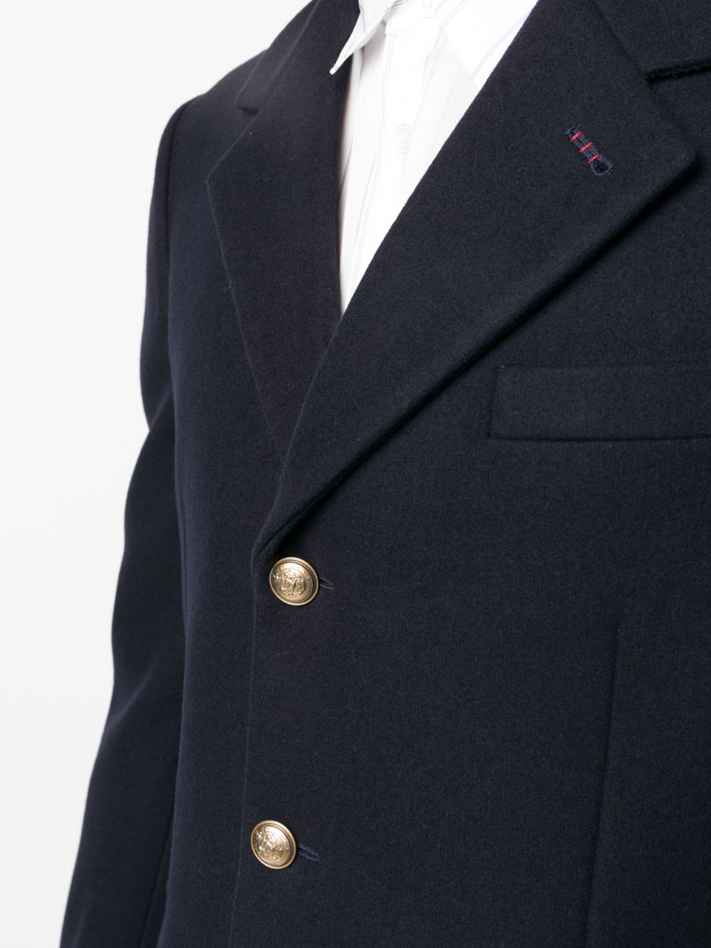 embossed-buttons wool single-breasted blazer from Gucci featuring prussian blue, wool, felted finish, embossed gold-tone buttons, vertical seamed, internal logo patch, notched lapels, front button fastening, long sleeves, chest welt pocket, two side flap pockets and full lining.