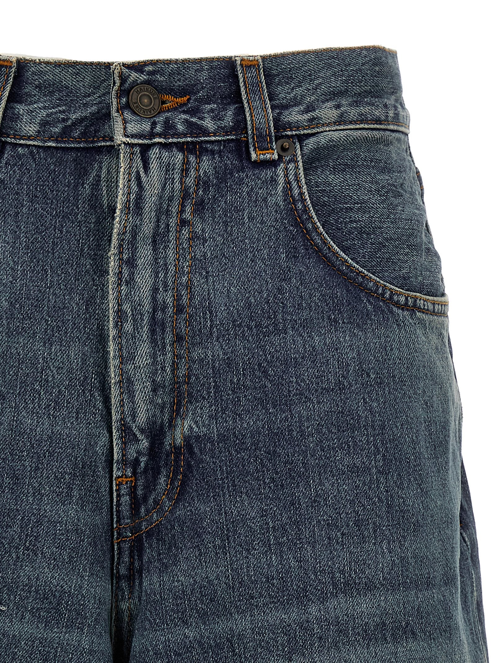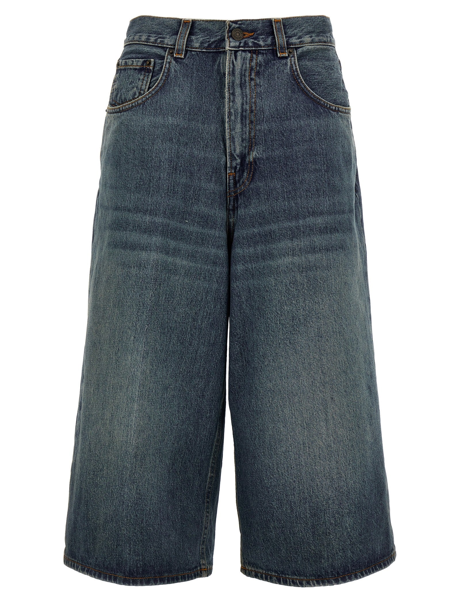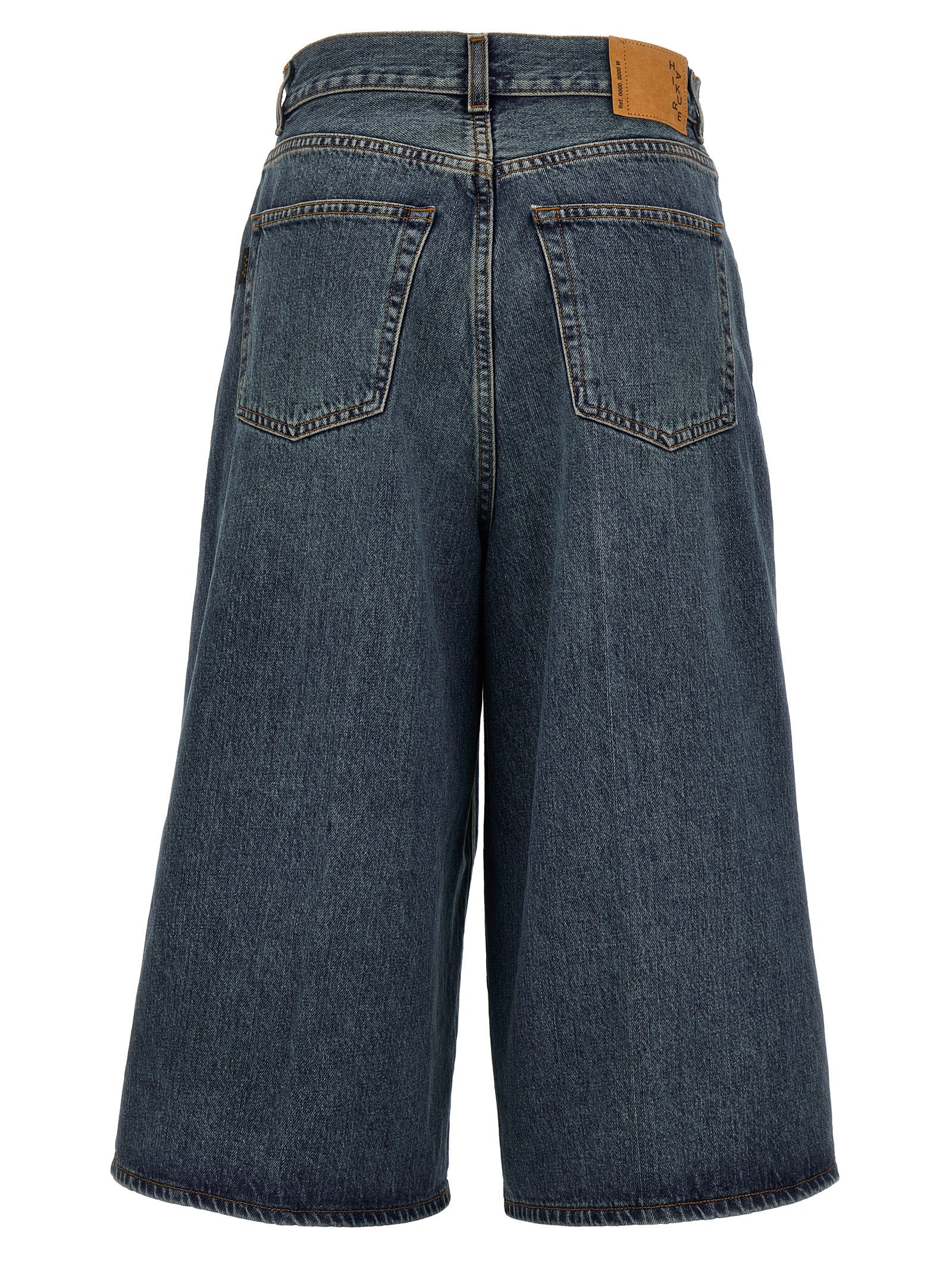 'Belle Oil Blue' cotton denim bermuda shorts with zip and button closure, five pockets, wide leg.