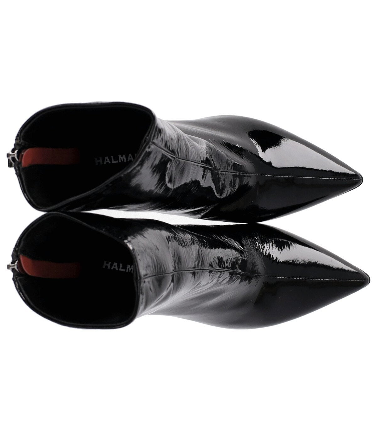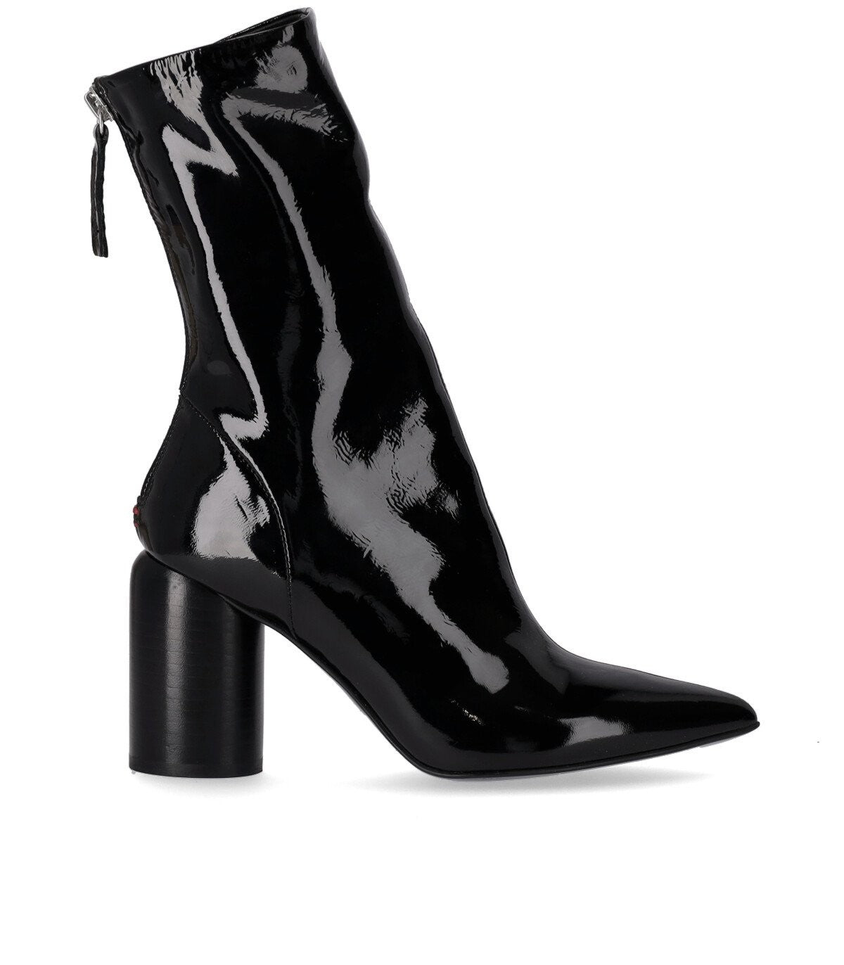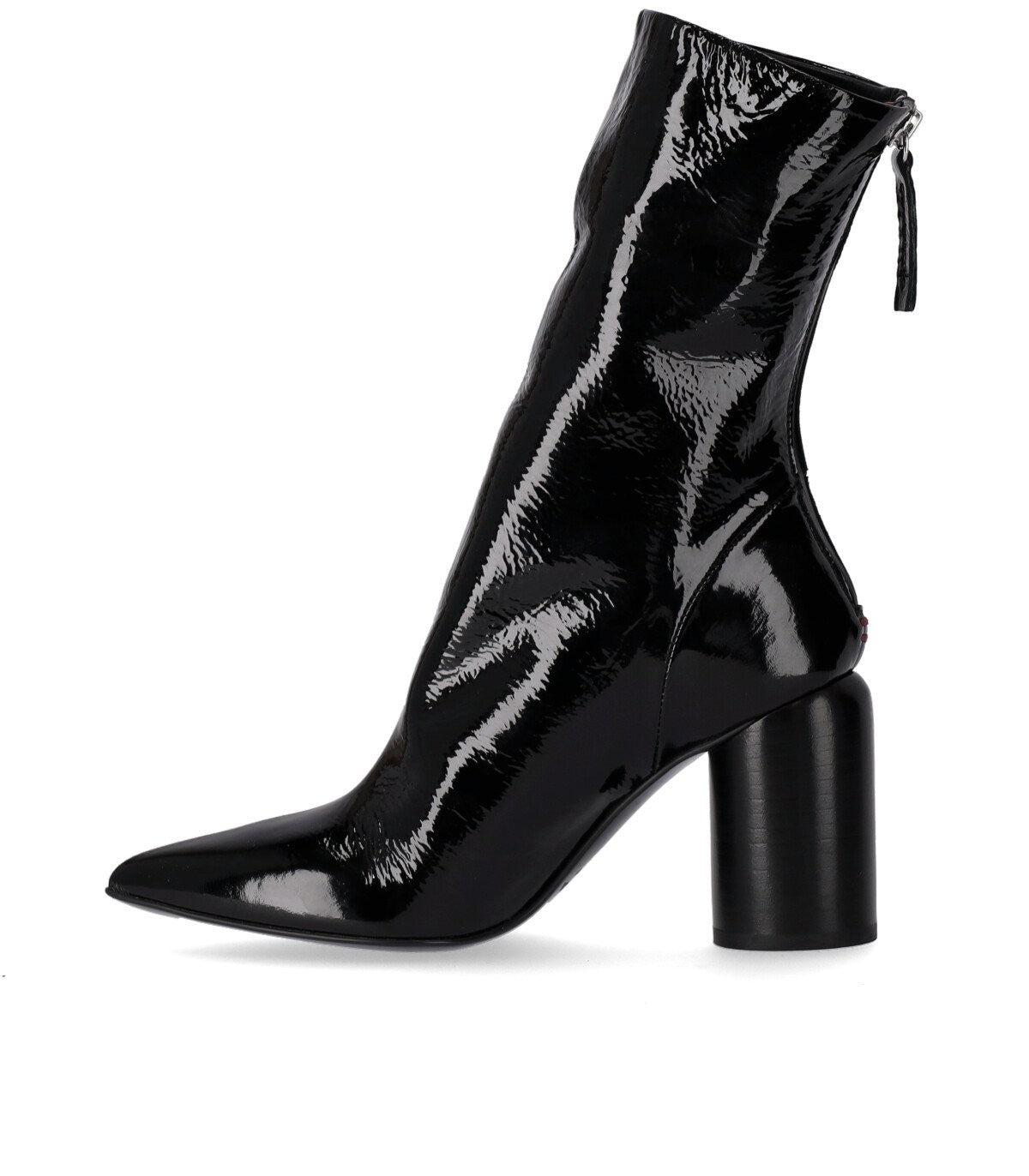 Roxy ankle boot by Halmanera made of black patent leather with leather lining and insole. Back zip closure, tapered toe and rubber sole. Heel height 8 cm.