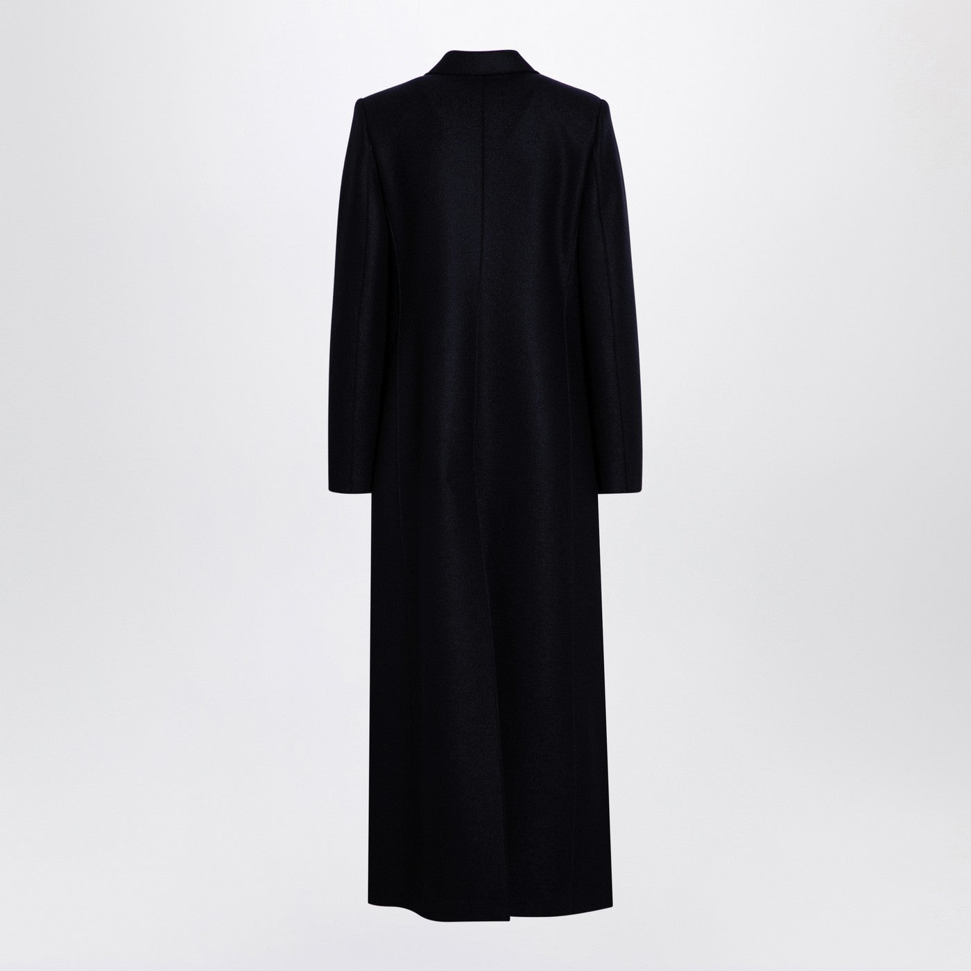 Double-breasted long coat by Harris Wharf London in navy blue virgin wool, featuring peaked lapels, a front button placket, a welt chest pocket and two front flap pockets.