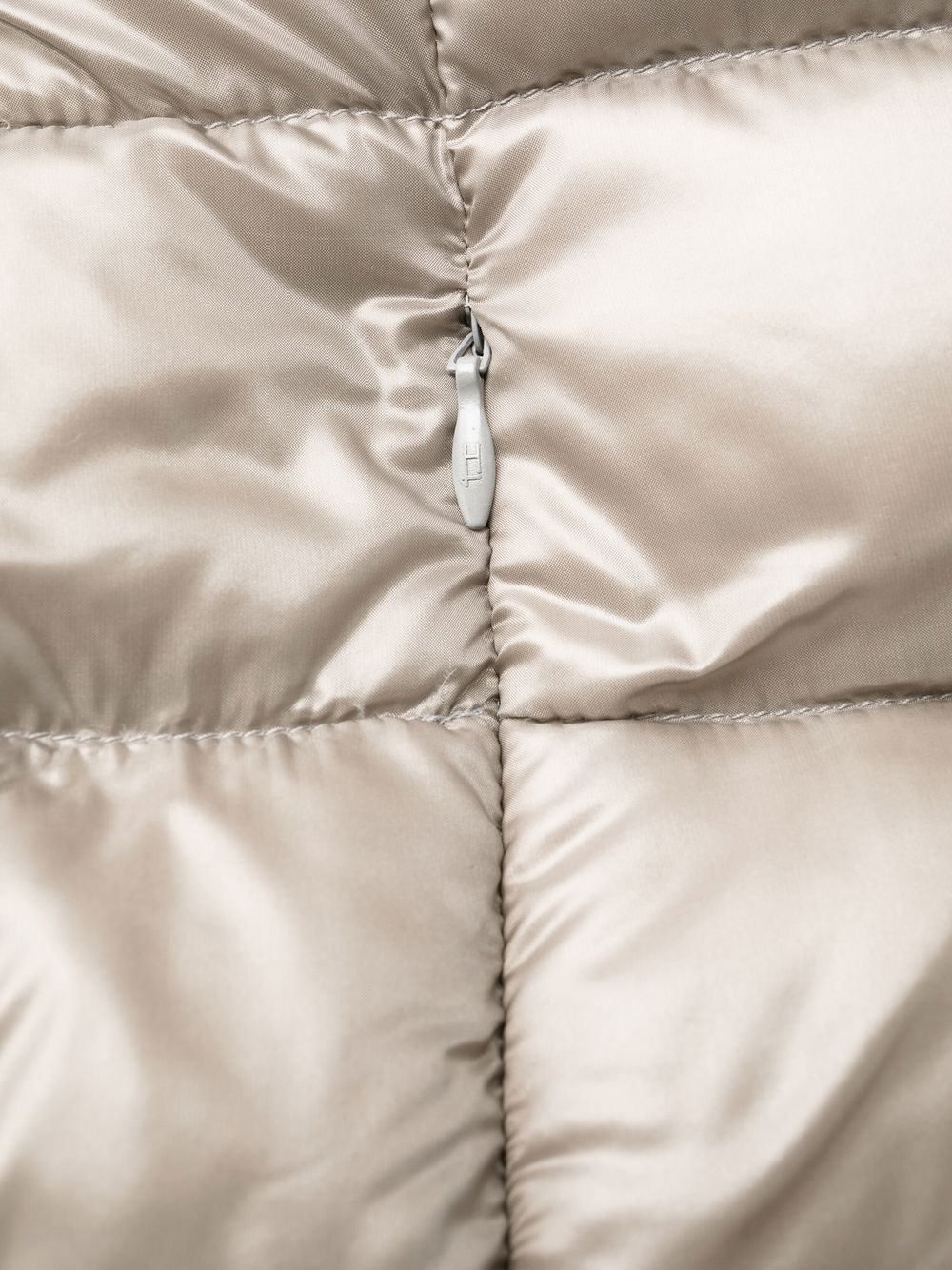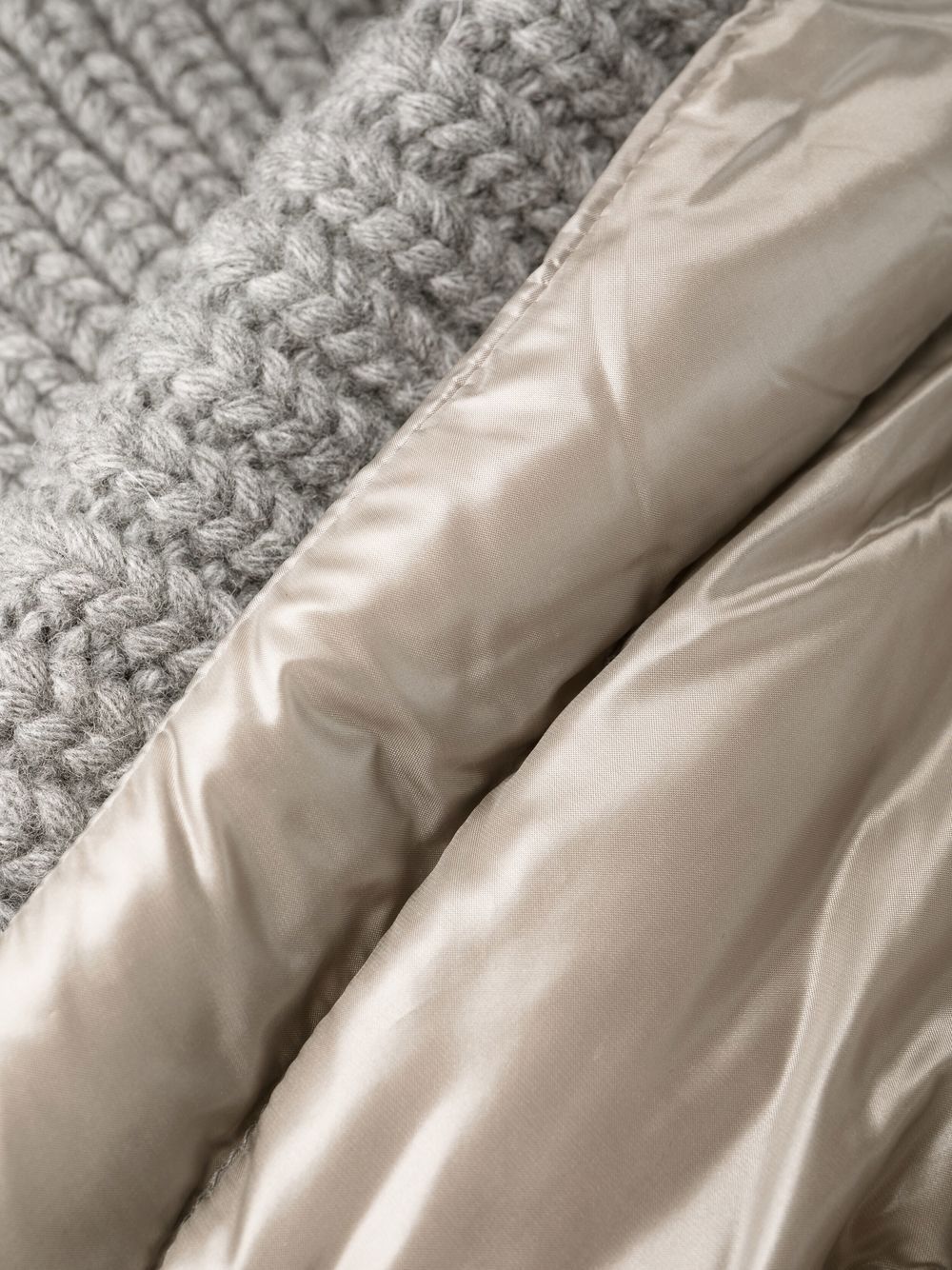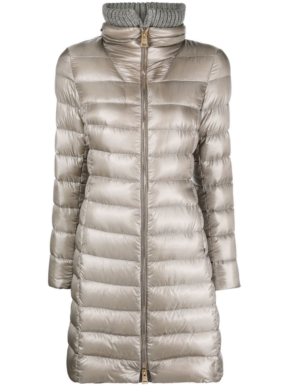 light grey feather down knitted collar padded design layered details high neck front two-way zip fastening long sleeves straight hem knee-length