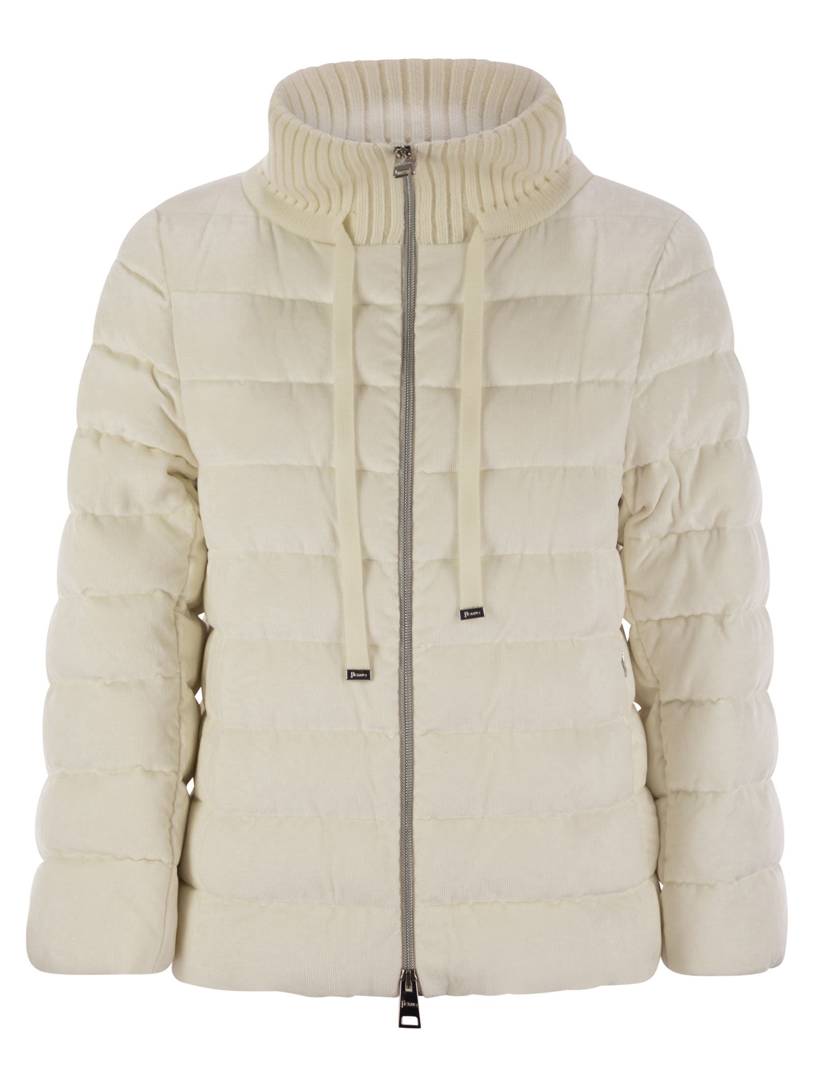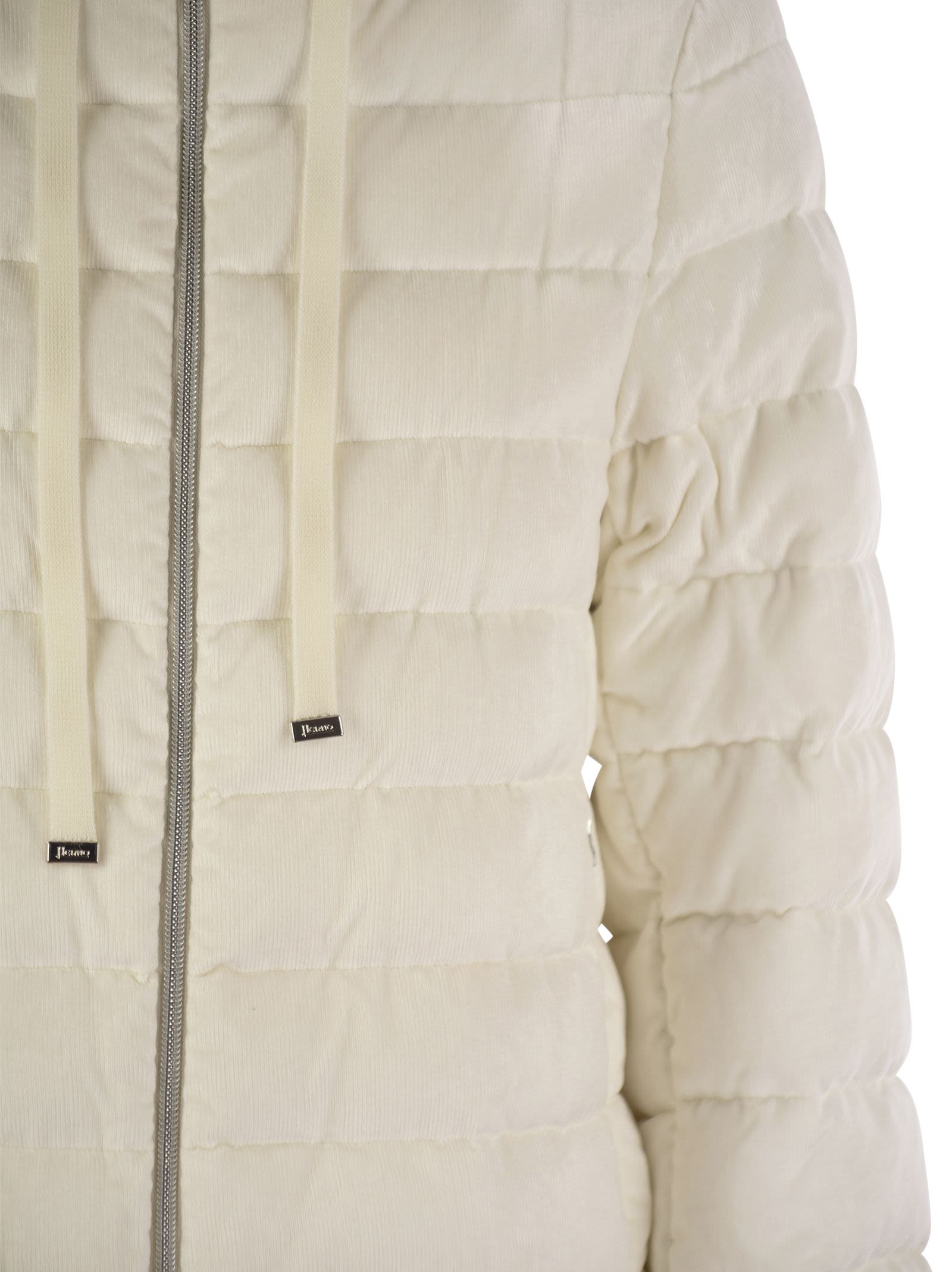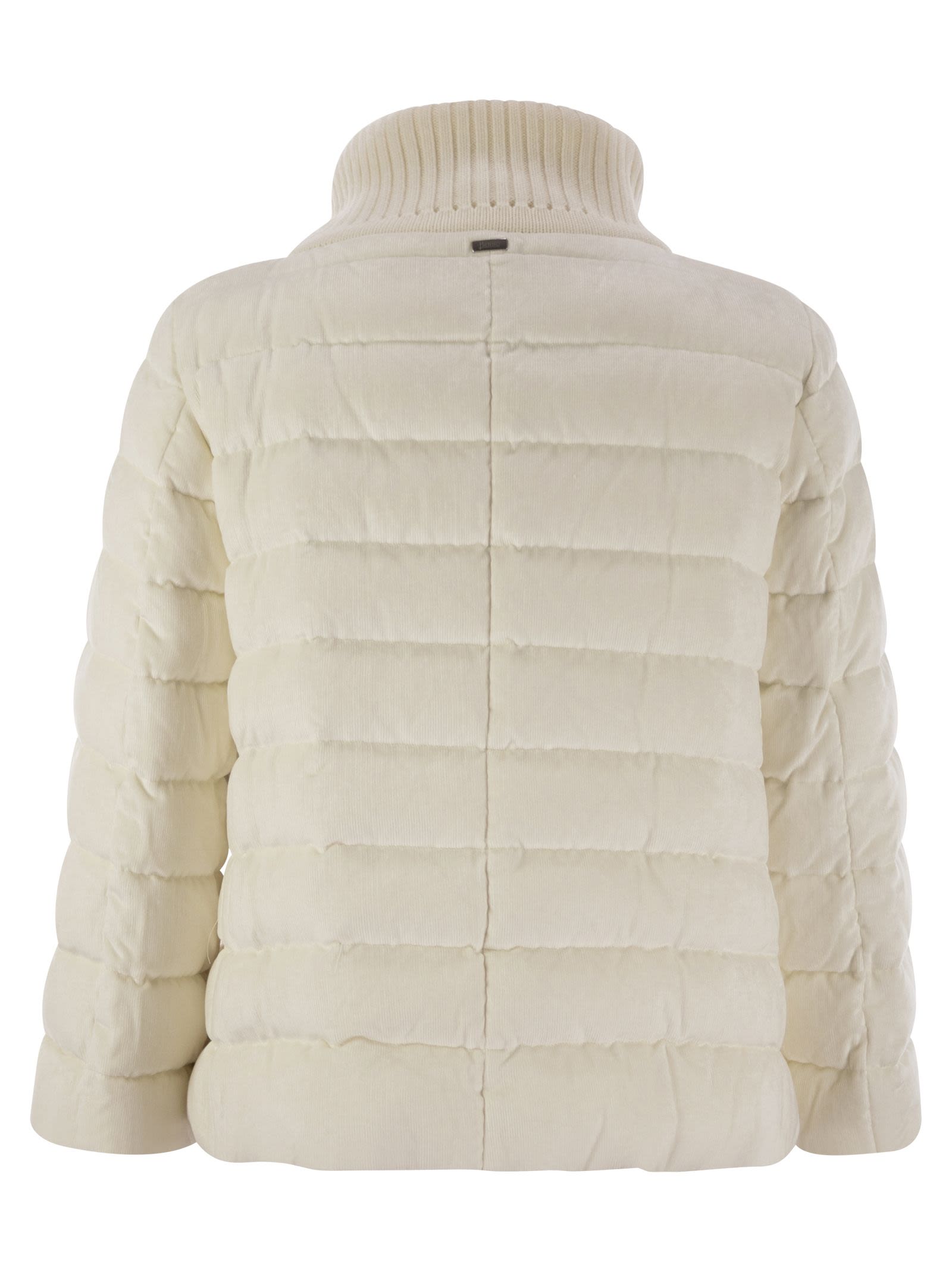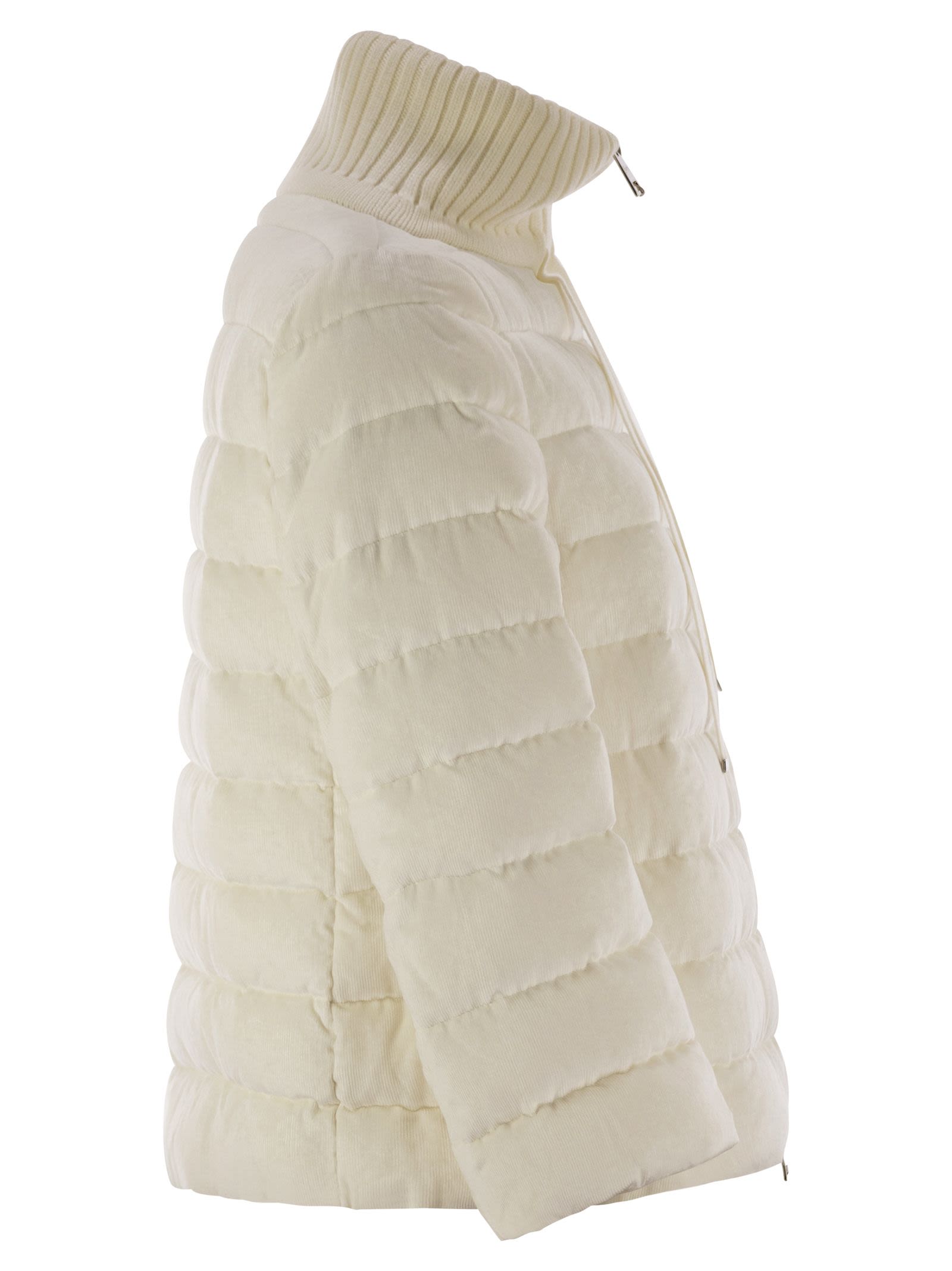 Cap made of viscose velvet with a thousand-striped effect, shiny and soft to the touch. The boxy, cropped cut offers maximum freedom of movement, while the knitted high collar protects and is soft against the skin. - Regular fit - Striped quilting - Knitted high collar with drawstring - Zipped welt pockets - Two-way zip fastening - Goose down filling DESIGNER ID: PI00125DR12631 1000
