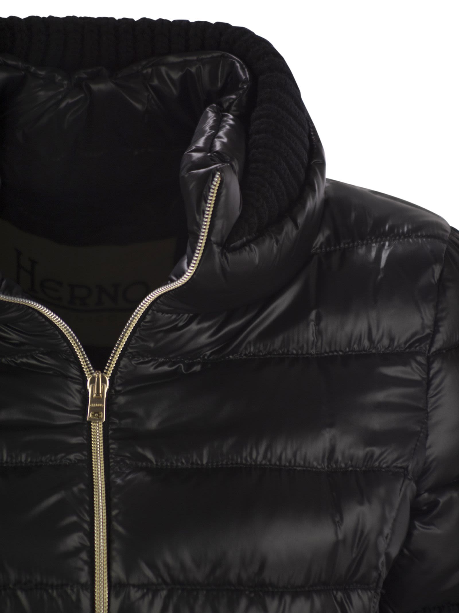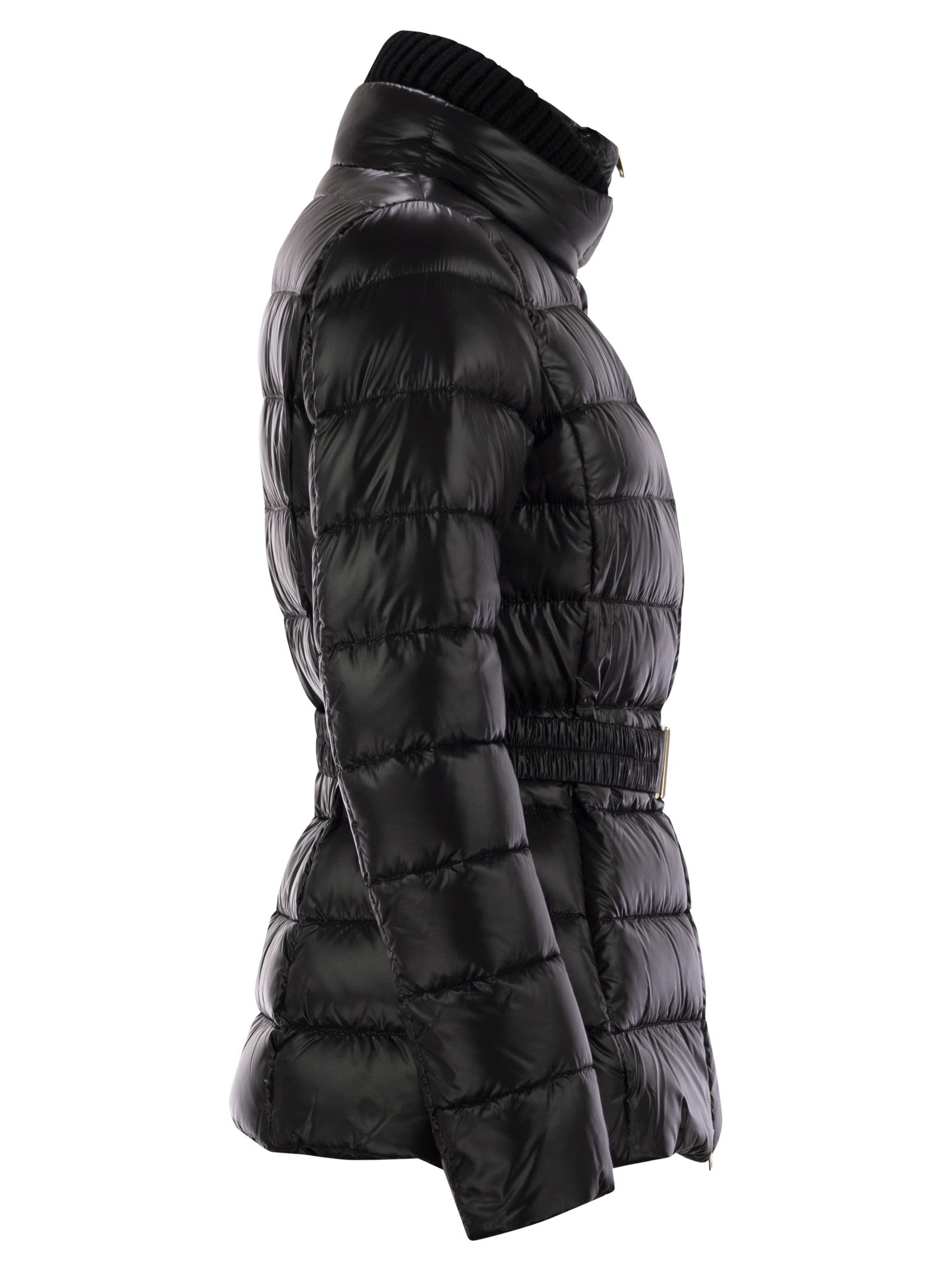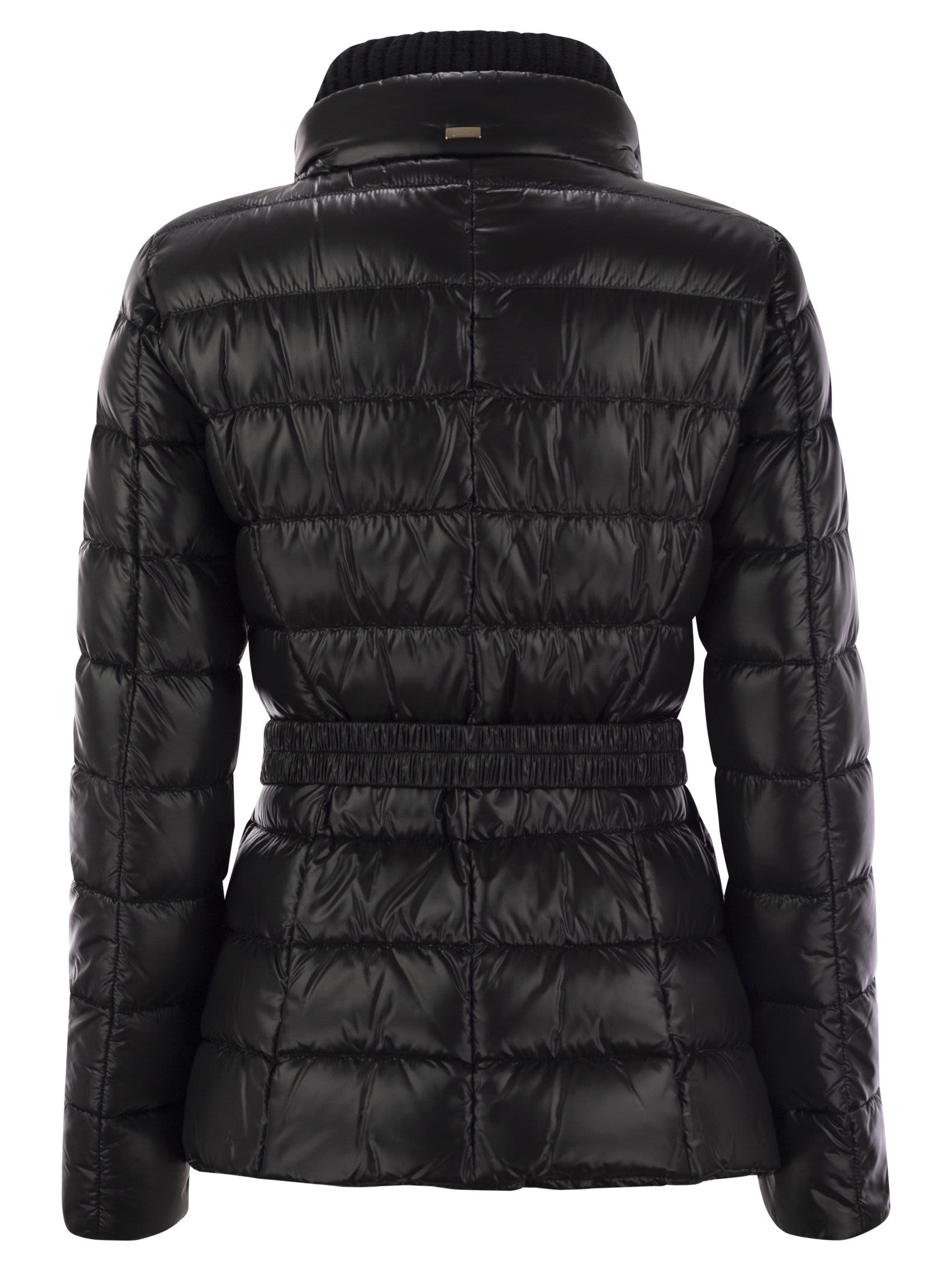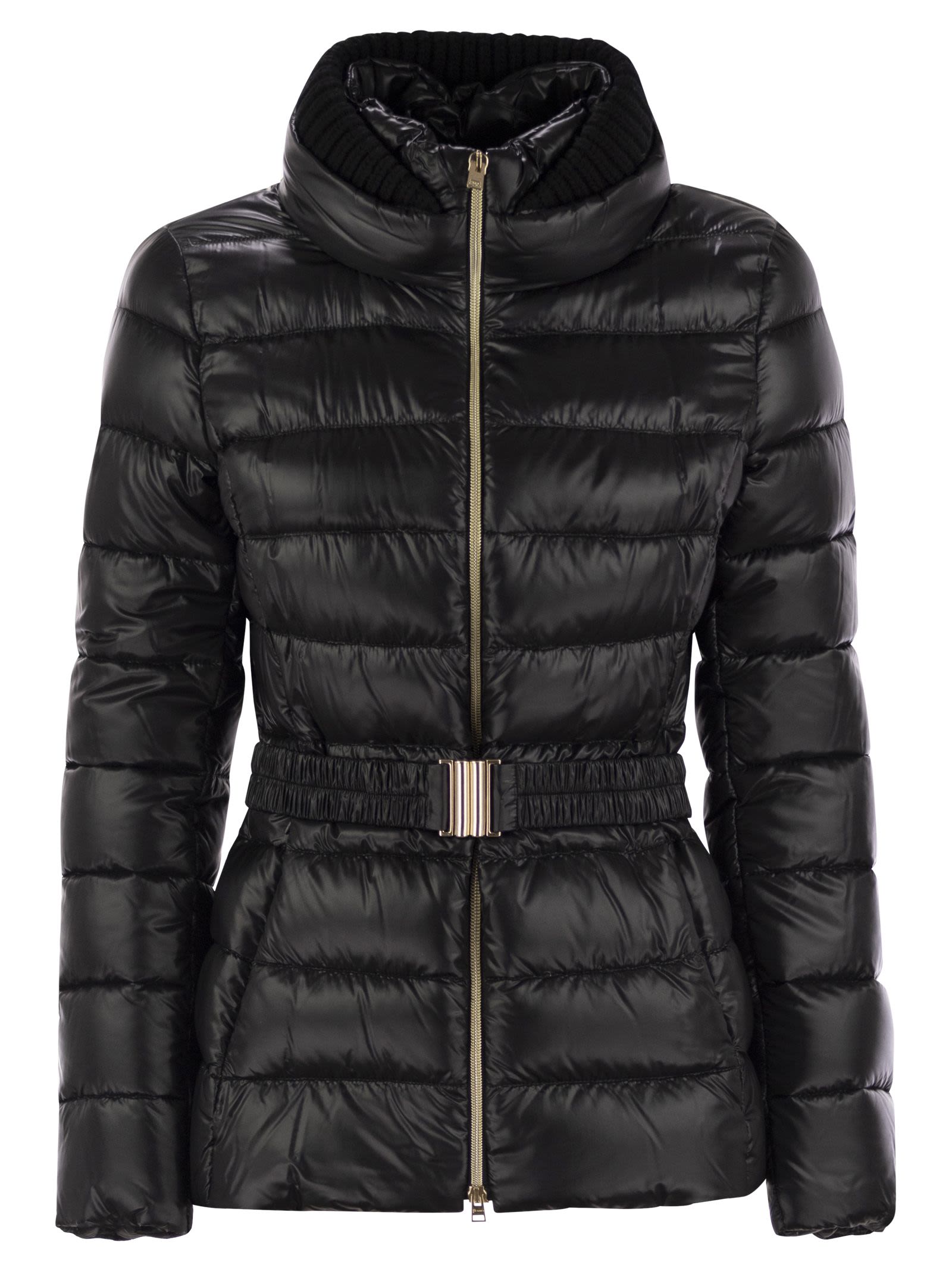 Jacket made of Herno's iconic ultralight nylon: an innovative technical fabric that combines good water resistance with a particularly luxurious feel similar to silk. The model is characterised by a slim design with a high collar finished in knit and an elastic waistband that enhances the silhouette. The garment's proportions are designed to follow your movements and ensure an impeccable fit, while the fine down filling is soft, light and retains warmth. - Slim fit - High collar - Rib knit hem - Long sleeves - Two-way zip fastening - Elastic belt with metal buckle - Pockets with invisible zip - Down filled - Performance: Water-repellent treatment DESIGNER ID: PI0485DIC M03 12017Z 9300