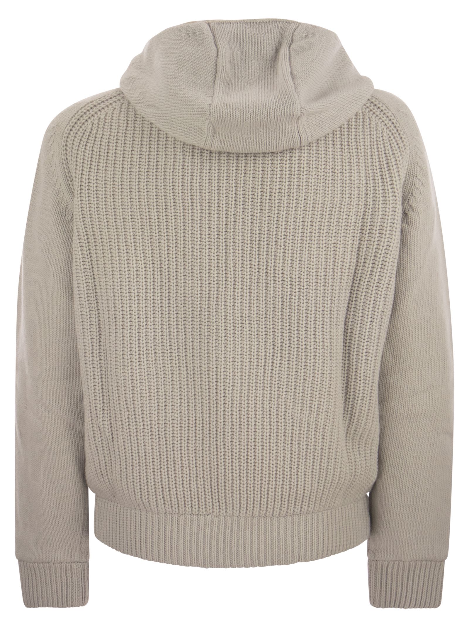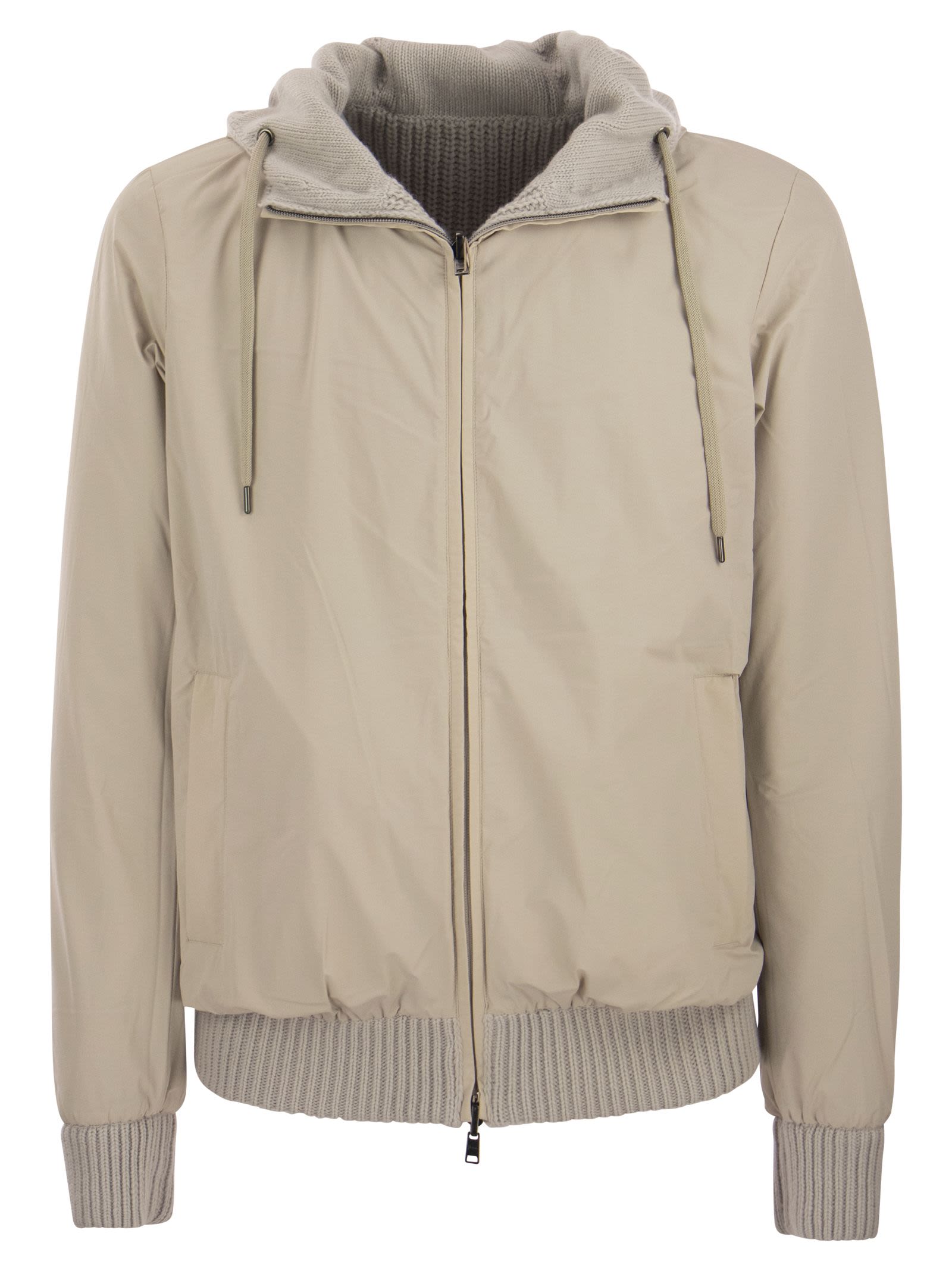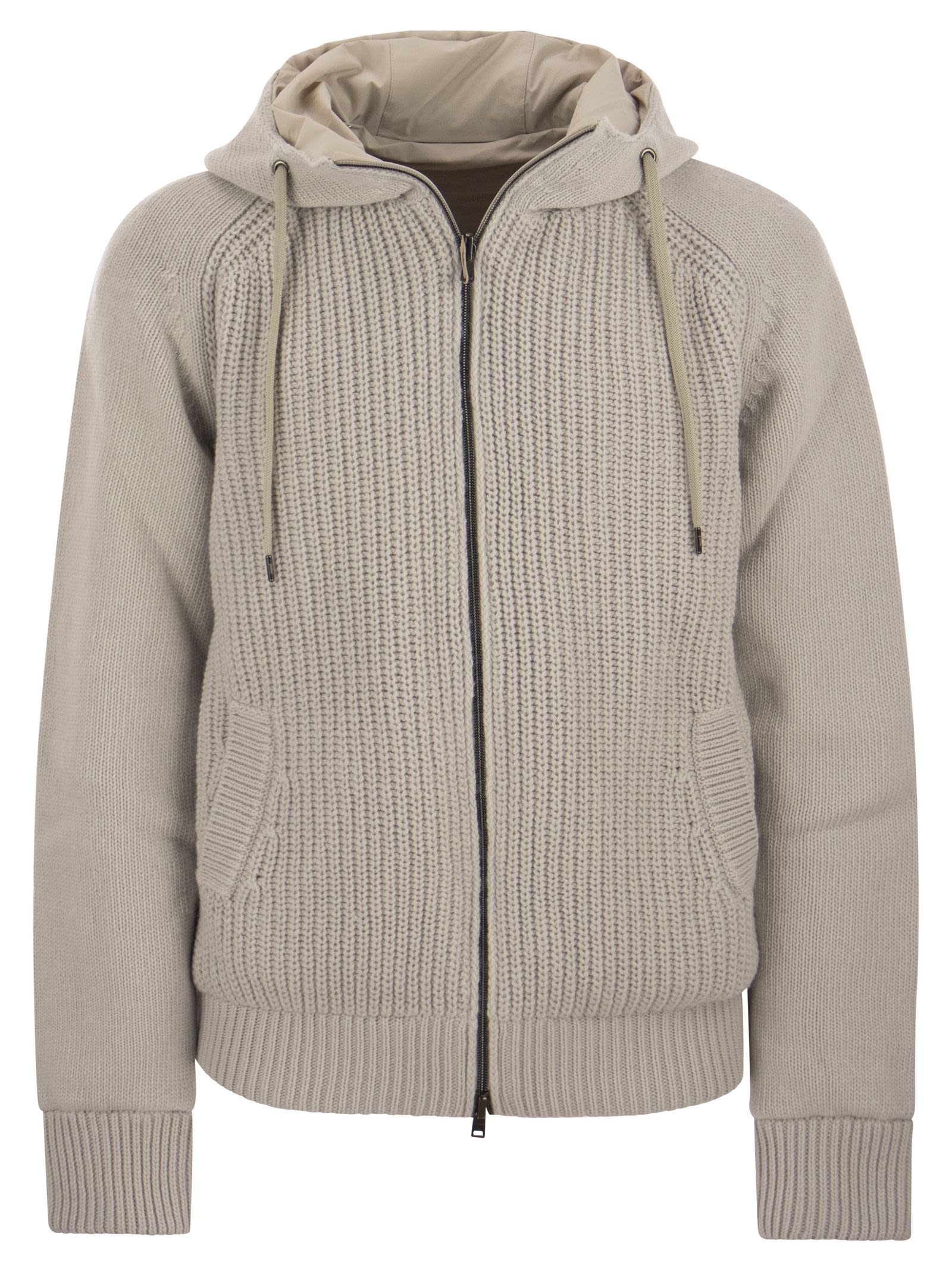 Soft-handed carded wool knit bomber jacket. The model is characterised by a reversible design with a stretch nylon fabric lining with light padding. - Regular fit - Reversible design with Ponente lining - Adjustable fixed hood with drawstring - Long sleeves - Two-way zip closure - Welt pockets - Wadding padding - Cob stitch work, fineness 5 - Reversible DESIGNER ID: MC00020UR 70145 1310