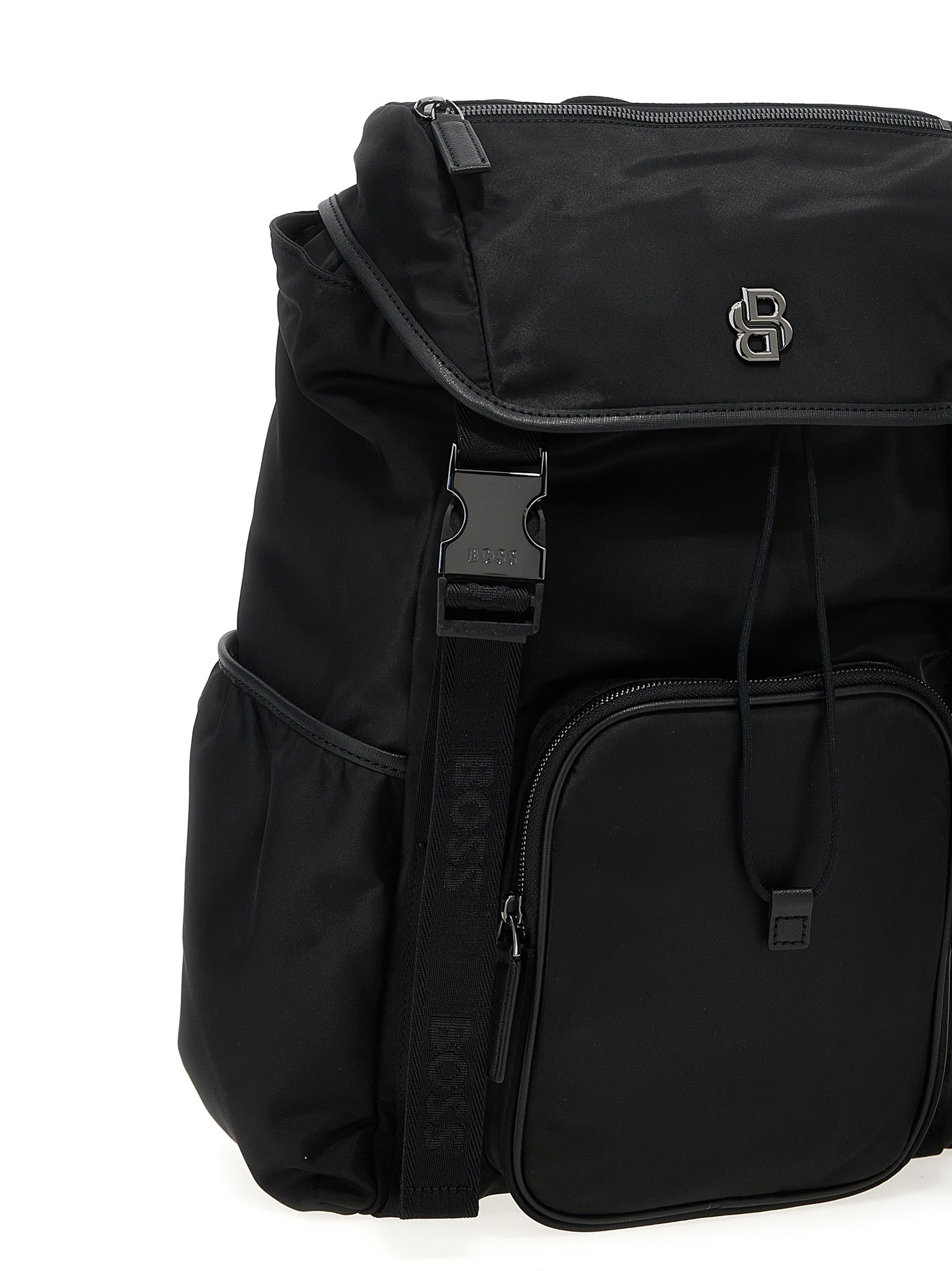 'BB' twill backpack with matte finish, flap closure with tuc, metal monogram Double B logo on the front, inner drawstring, external zip pockets, fixed top handle, adjustable shoulder straps, padded backrest. SUSTAINABLE: Product made from recycled polyester.
