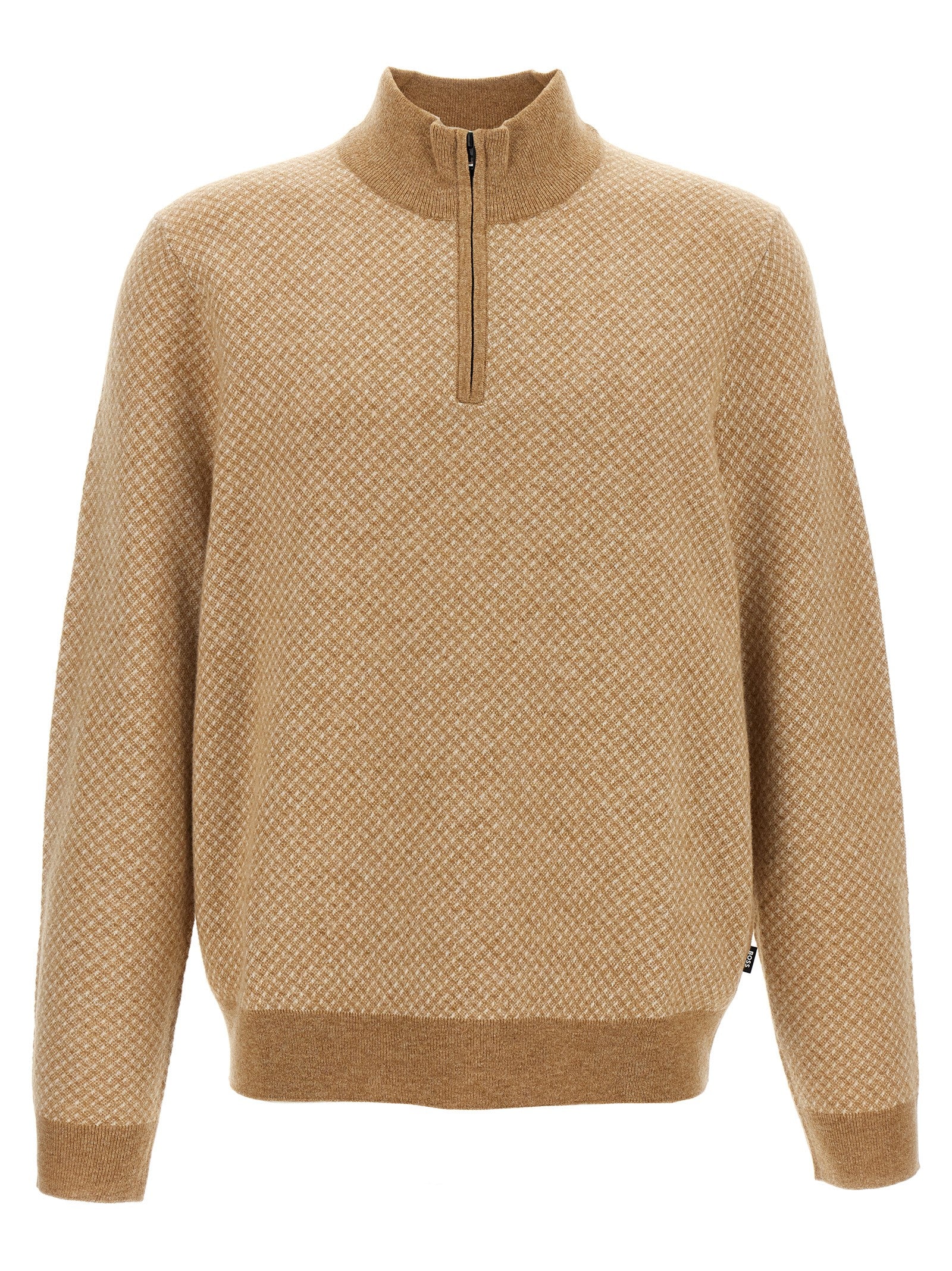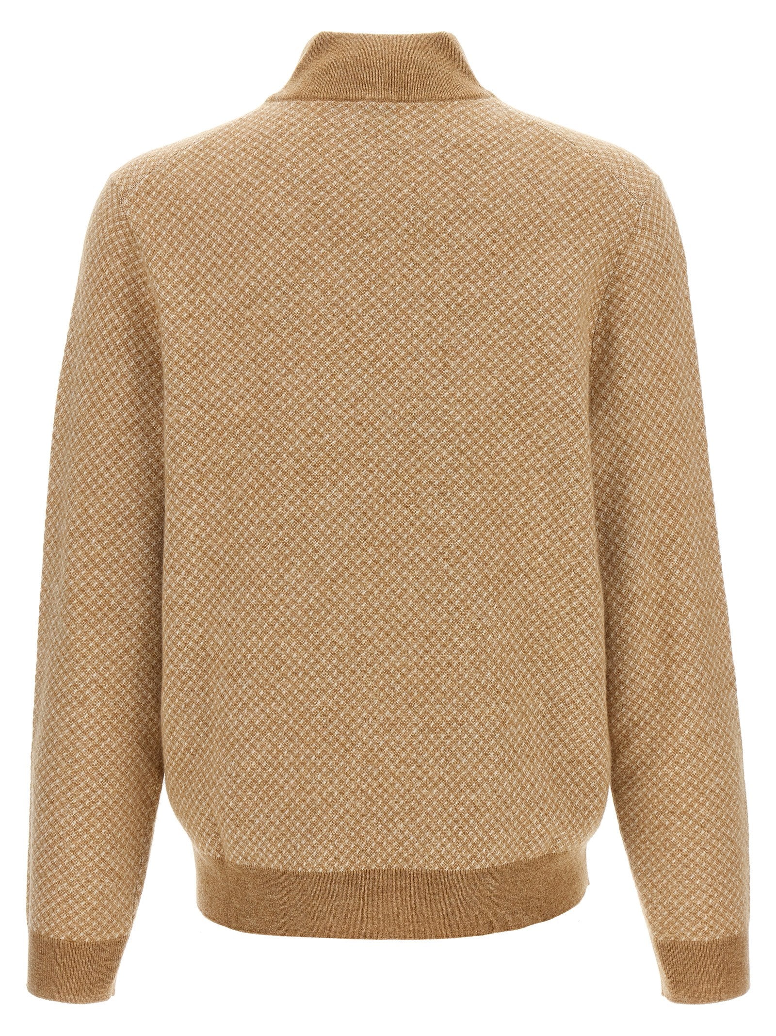 Two-tone jacquard wool 'Eltorino' sweater, half zip collar, long cuffed sleeves.