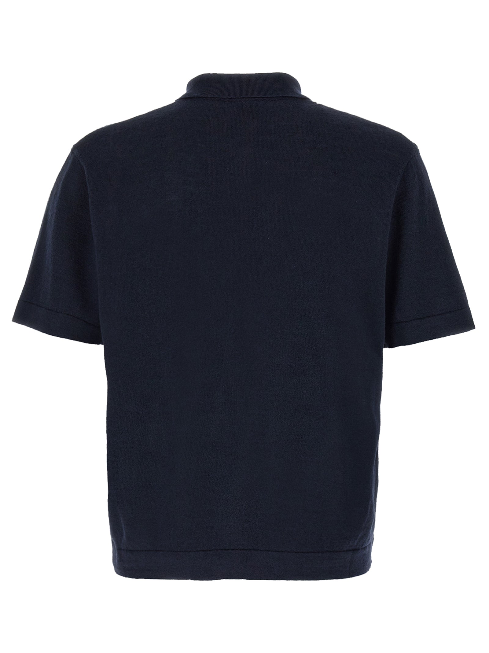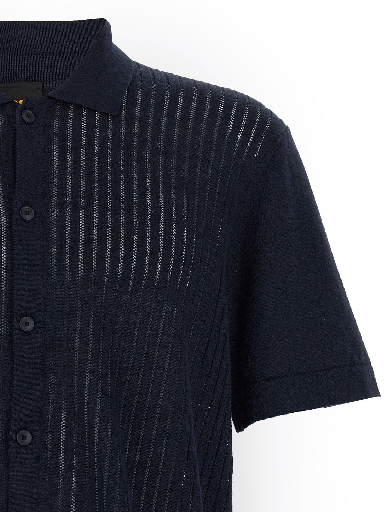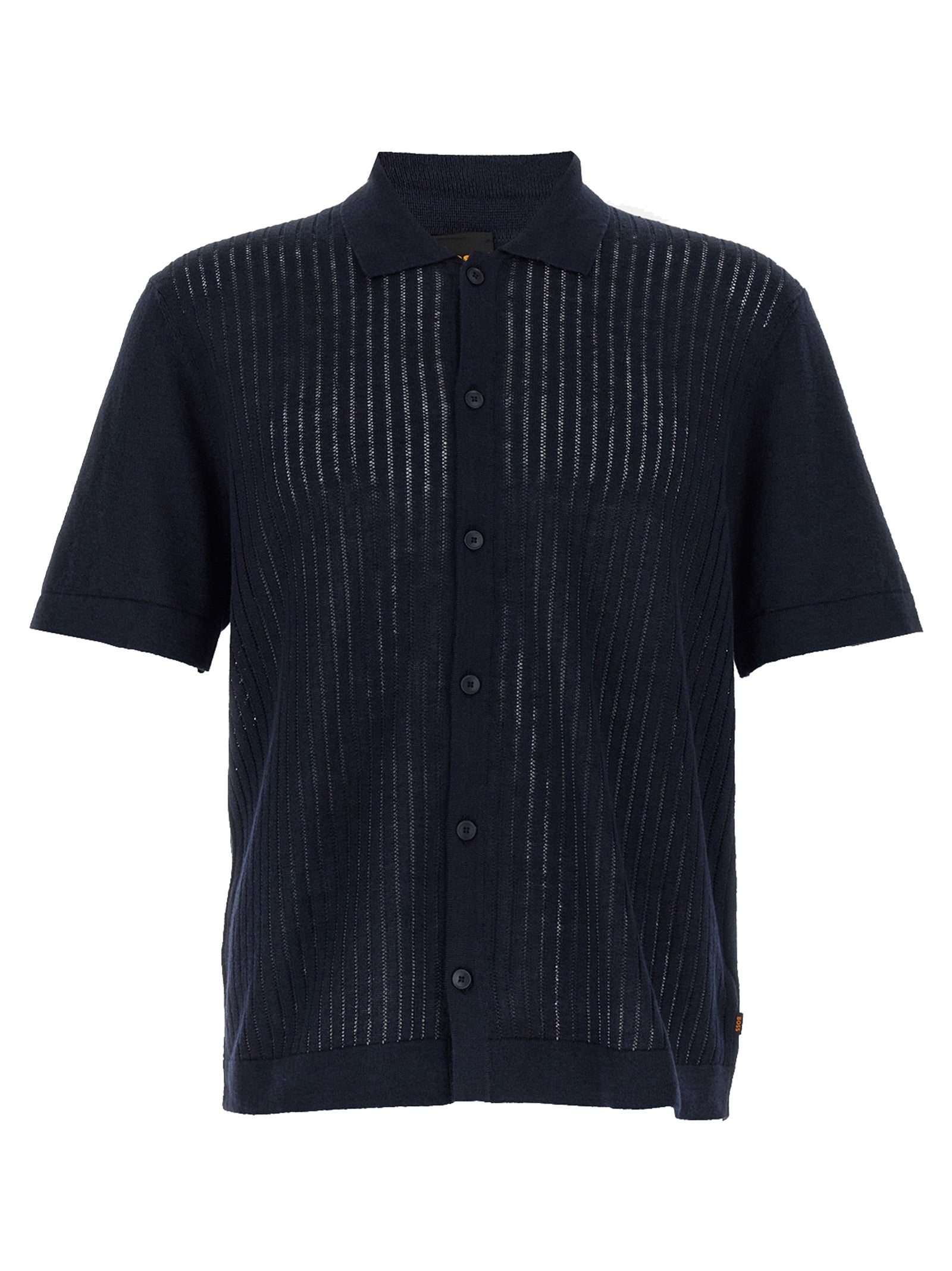 Linen blend knit shirt with classic collar, button closure, front perforation, short sleeves.