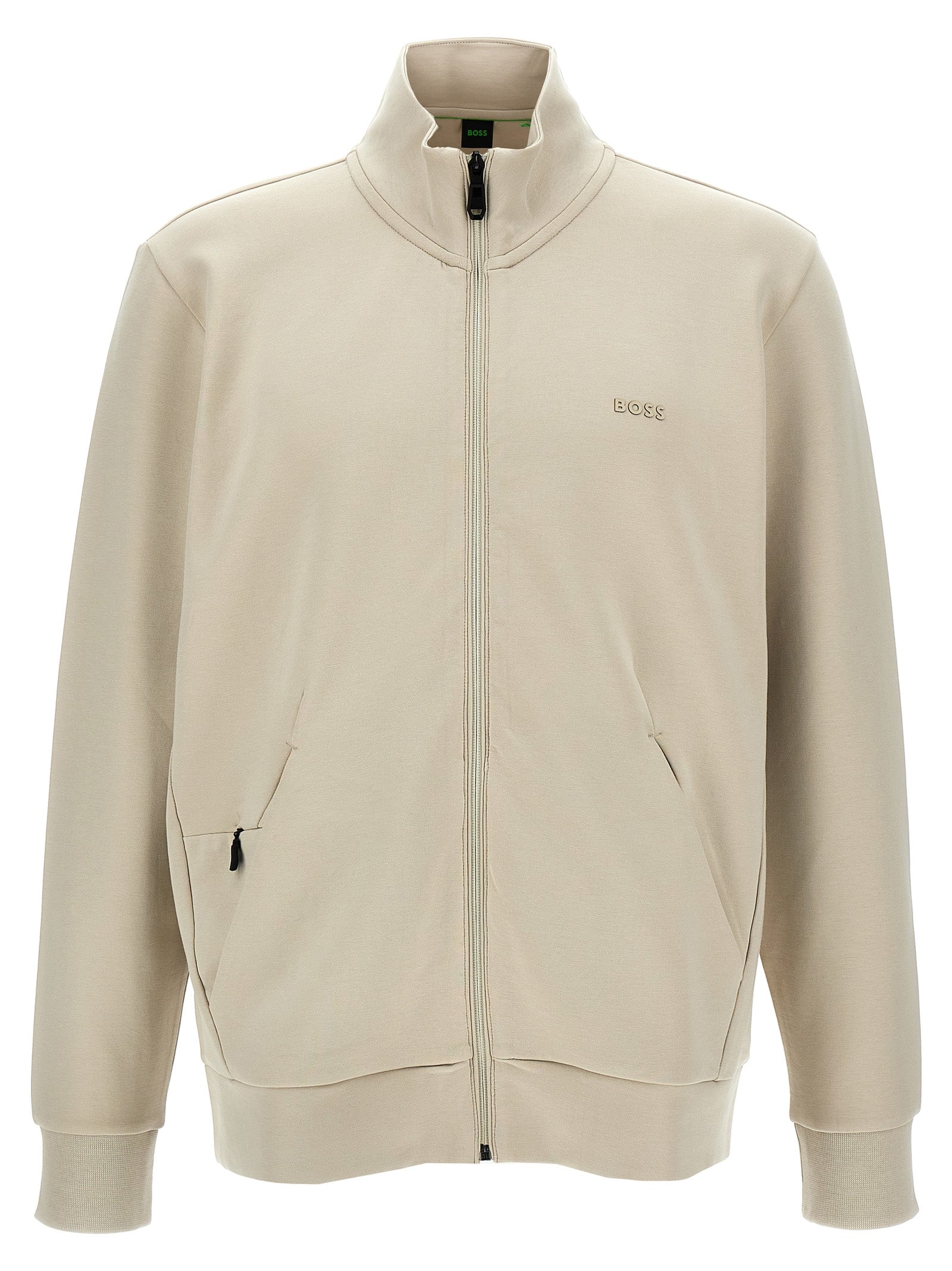 'Skaz' stretch cotton sweatshirt, high neck, pockets, zip closure, long cuffed sleeves.