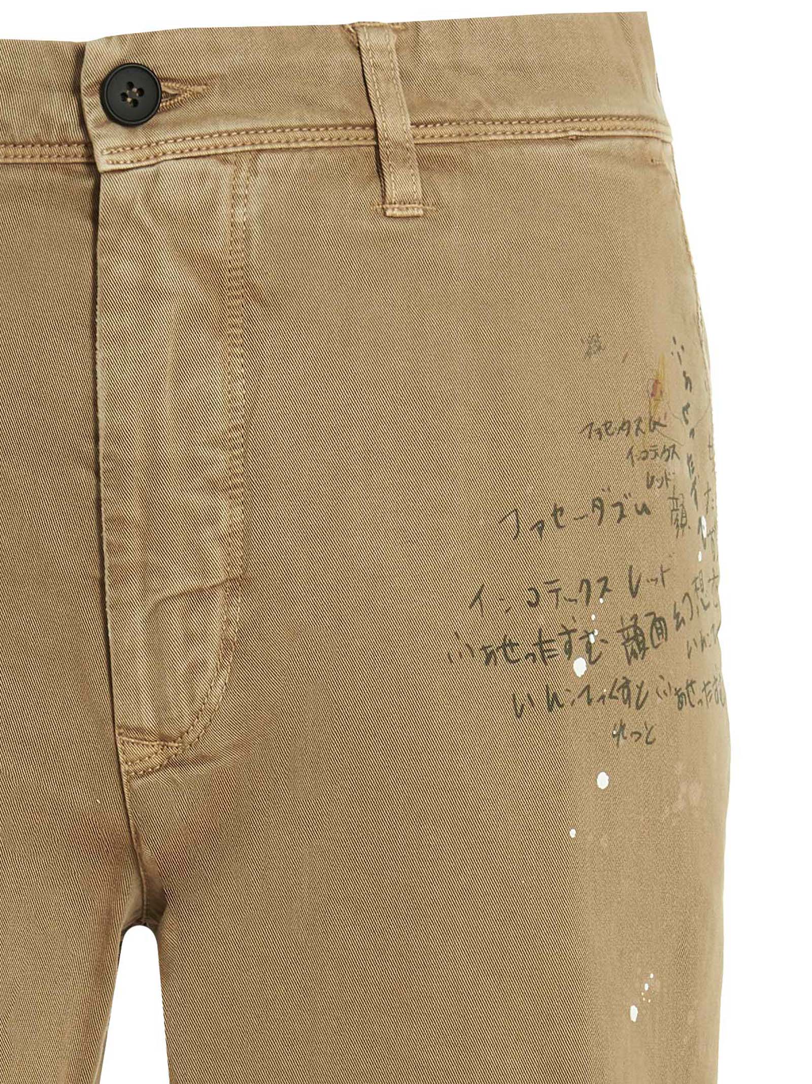 Cotton pants with an all-over print, a zipper and button closure, pockets, used effect and patent leather details.