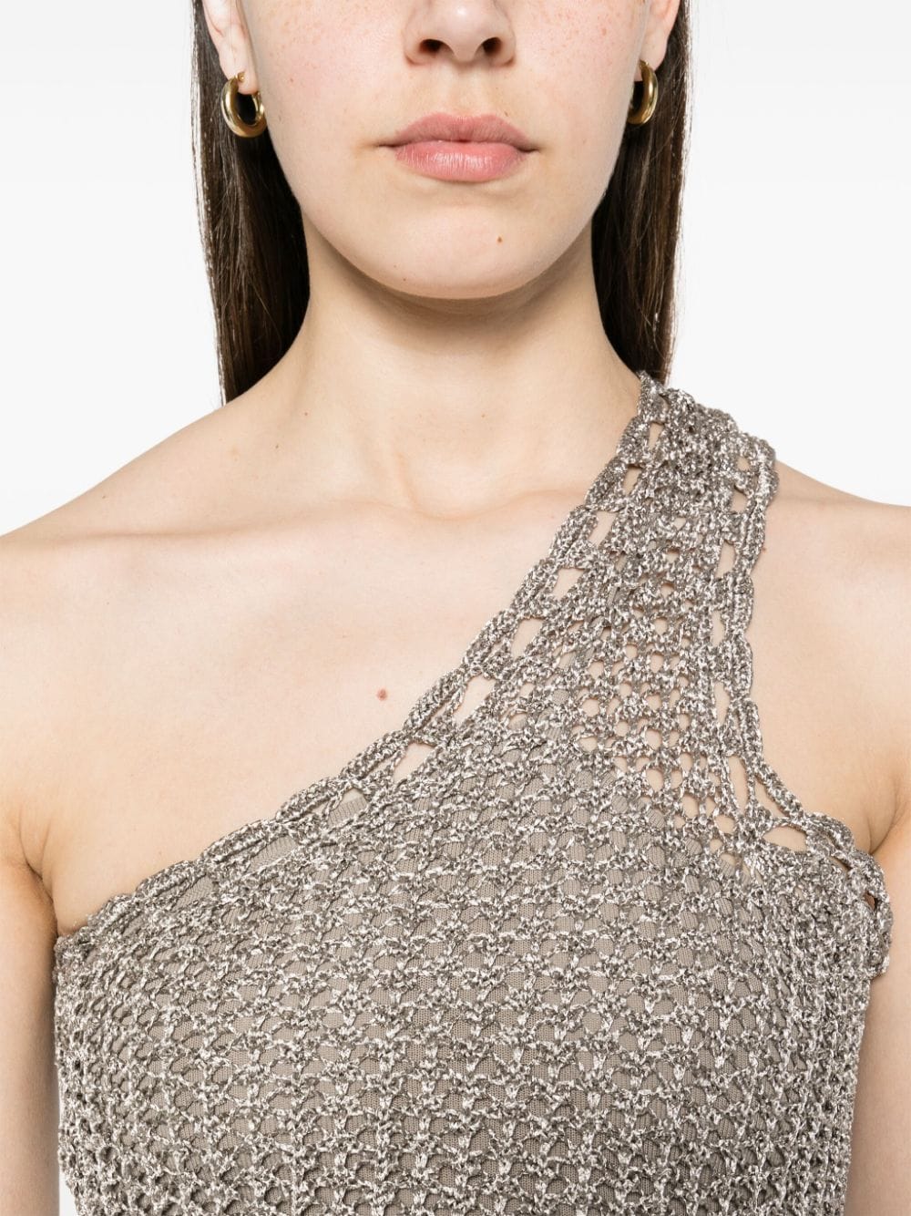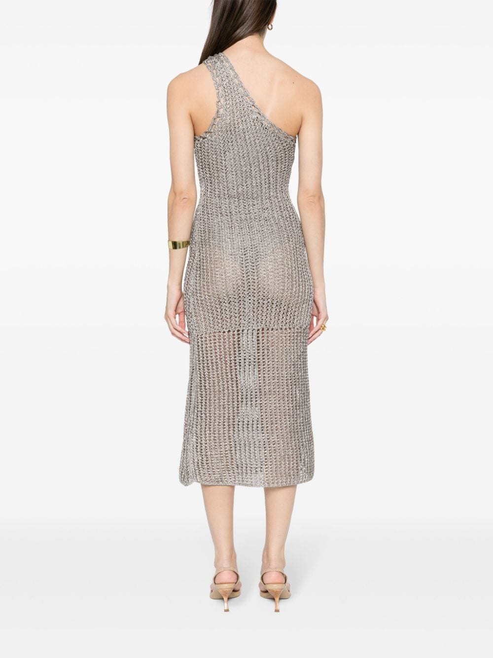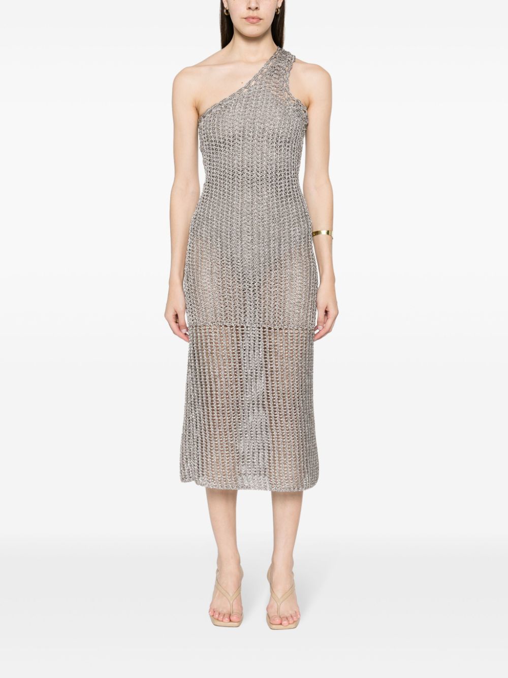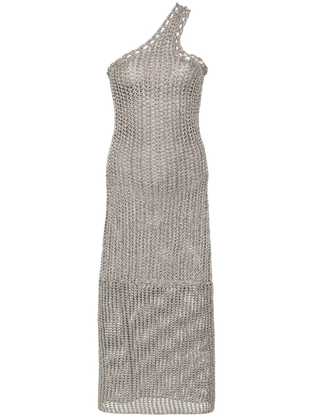 grey metallic effect semi-sheer construction open knit one-shoulder sleeveless mid-calf length partial lining pull-on style