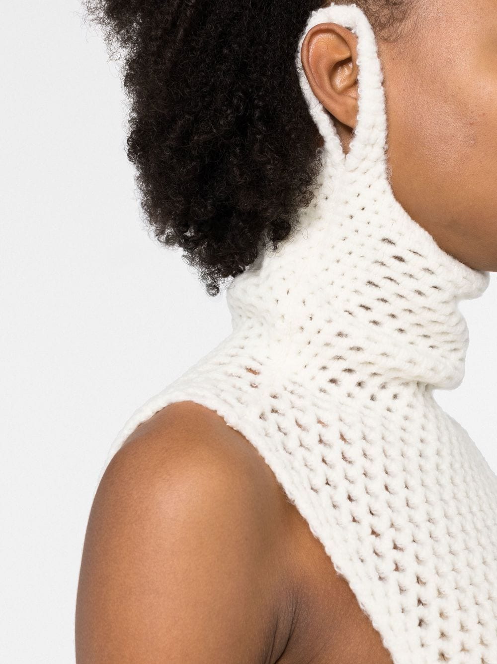 Map crochet minidress from Isa Boulder featuring white, stretch-design, open knit, high neck, sleeveless, fitted waistline and thigh-length.