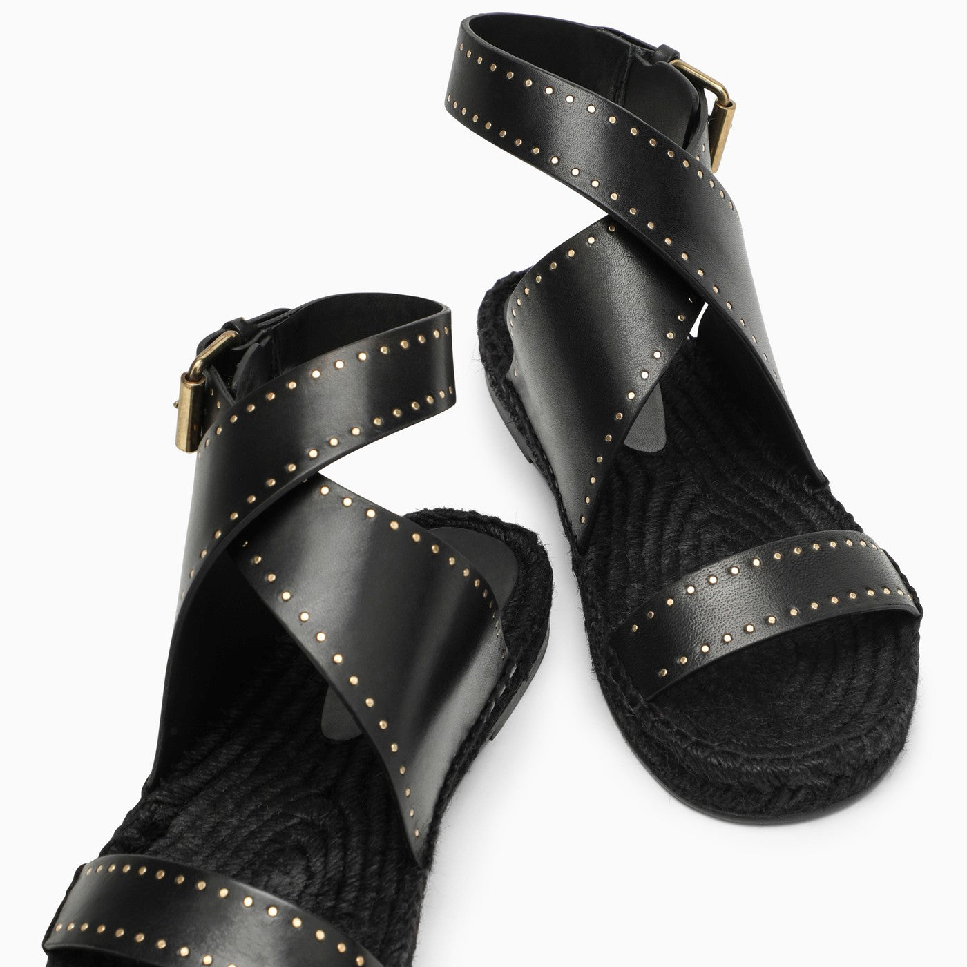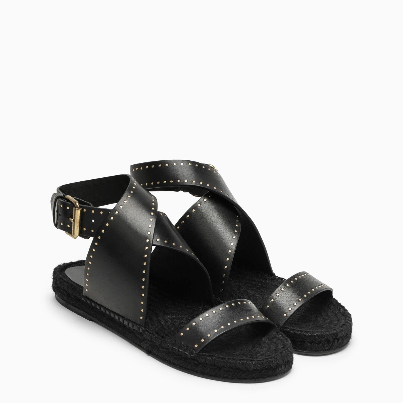 Black leather sandal by Isabel Marant featuring an open round toe, adjustable buckle ankle strap, small gold studs and leather sole.