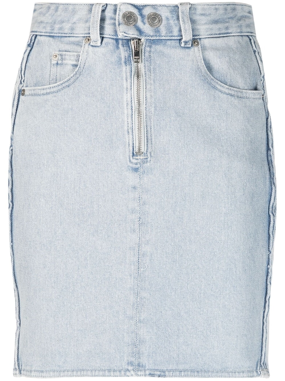 high-waisted denim skirt from ISABEL MARANT featuring blue, cotton, high waist, front button and zip fastening, belt loops, two rounded pockets to the sides, logo patch to the rear and two rear patch pockets.