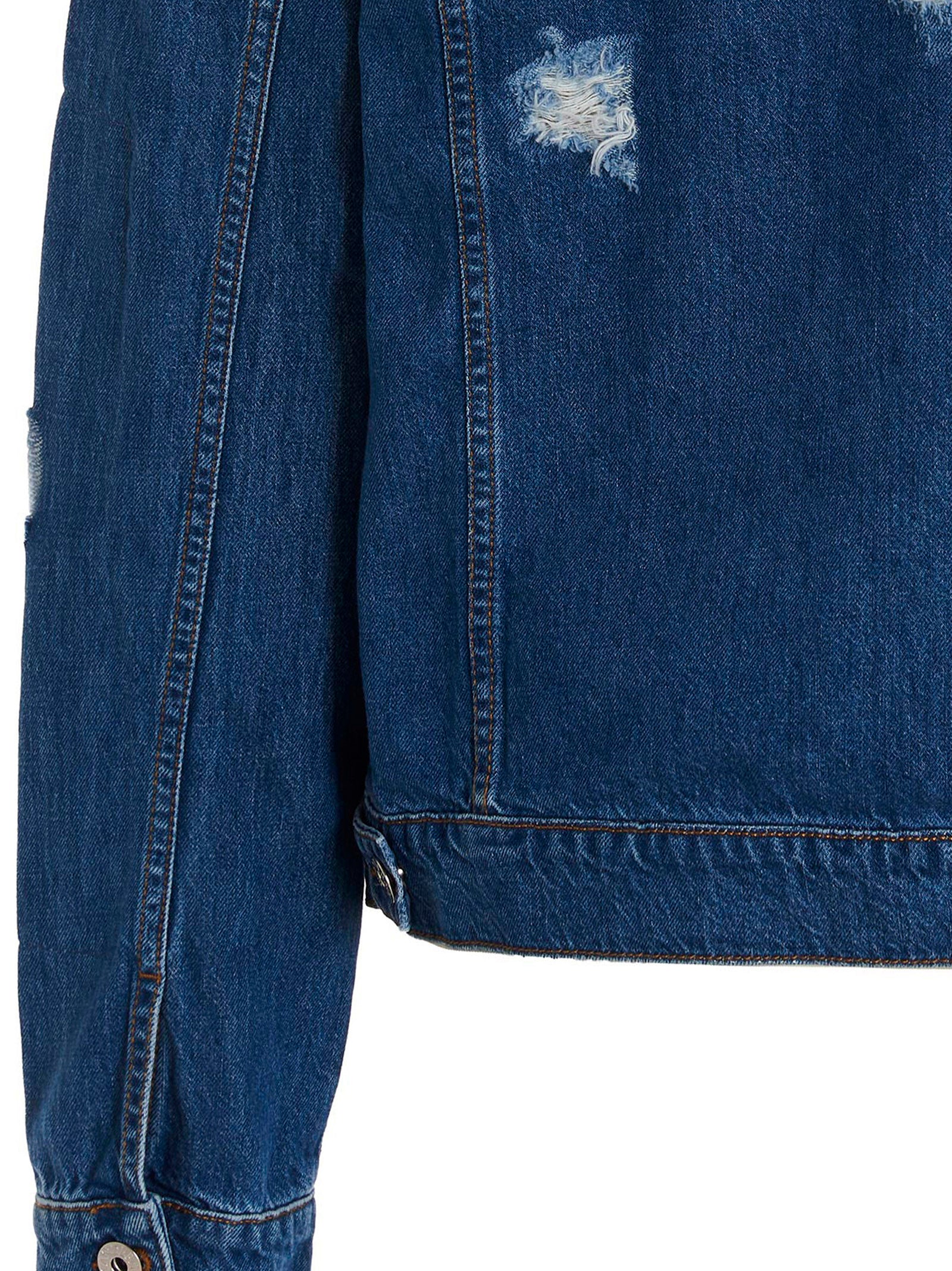 Distressed and destroyed effect cotton denim jacket, with button closure, pockets, back leather logo patch, long cuffed sleeves.
