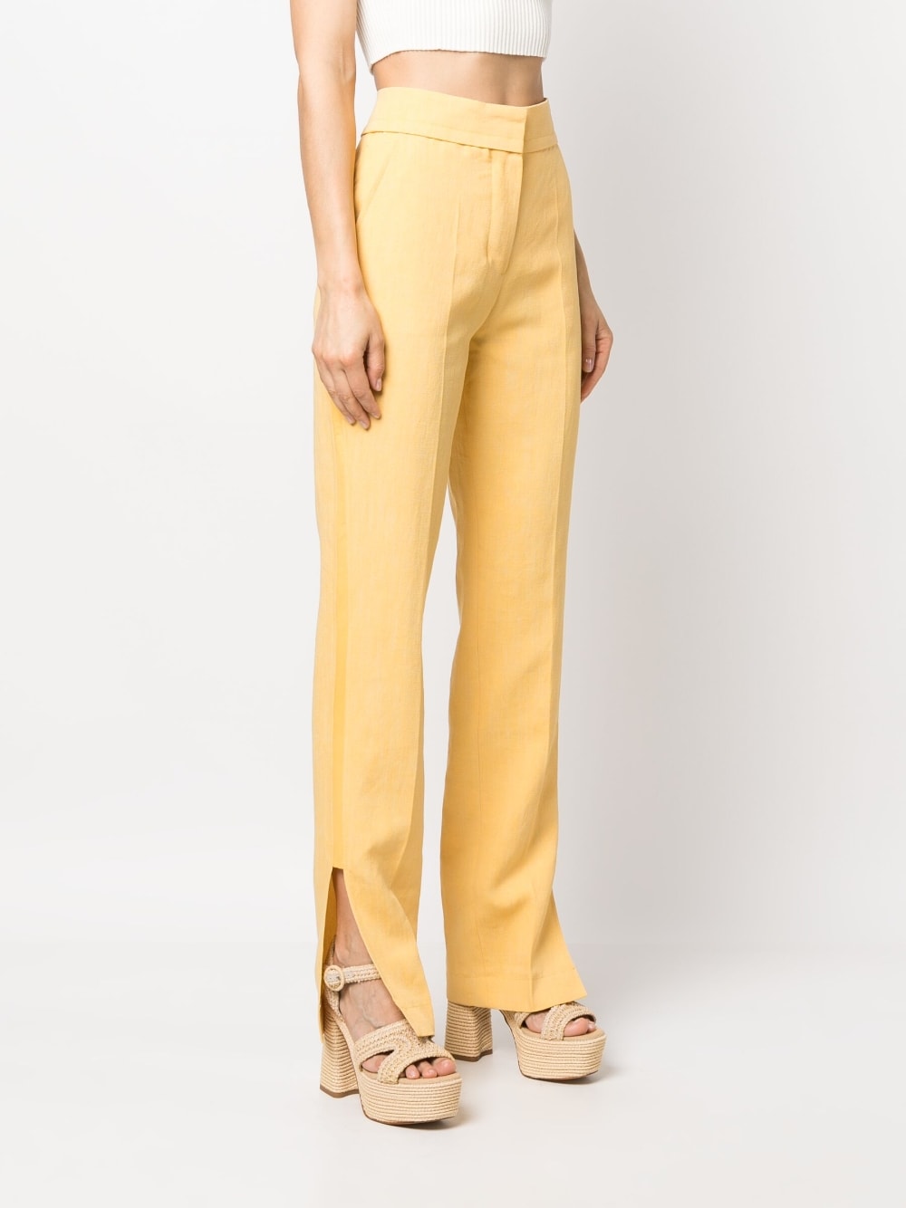 Le pantalon Tibau high-waisted trousers from Jacquemus featuring yellow, linen blend, high waist, concealed front fastening, tapered leg, side slits, two diagonal pockets to the sides and two rear welt pockets. This item contains at least 50% materials which are certified or widely recognised as having a lower environmental impact through production and/or manufacturing processes that reduce water consumption and the use of harmful chemicals, or re-use by-products of the production process.. Learn more about what makes a product Conscious on our Conscious Criteria page.