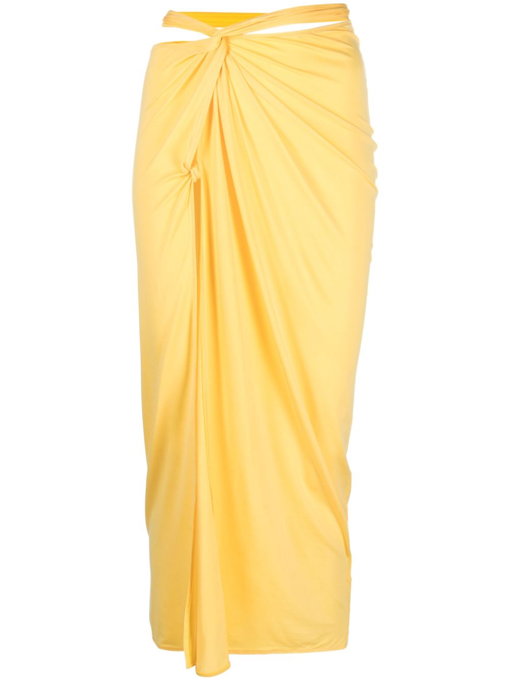 Espelho cut-out midi skirt from Jacquemus featuring yellow, stretch-design, cut-out detailing, twist detailing, high-waisted, side slit, straight hem and mid-length.