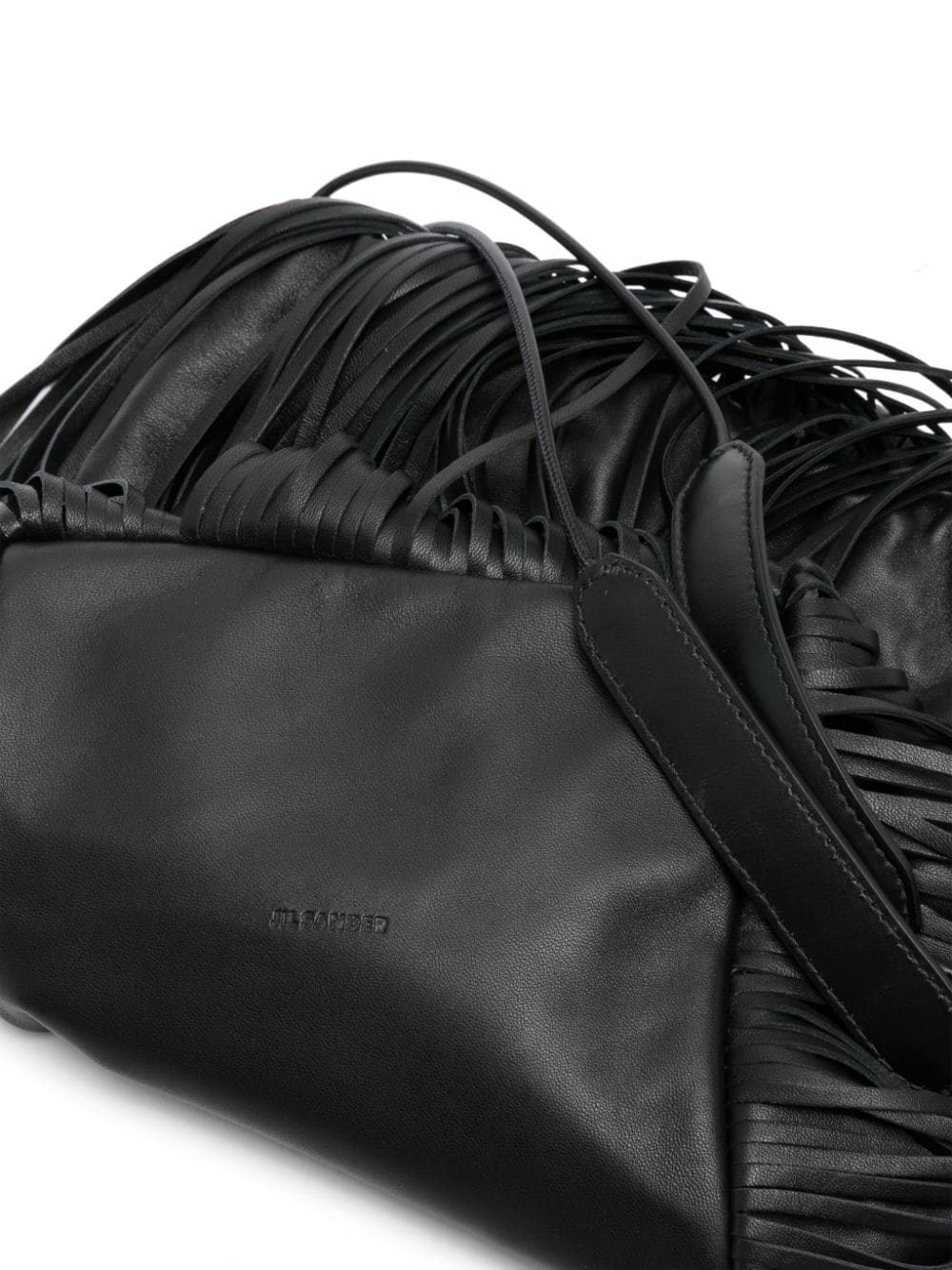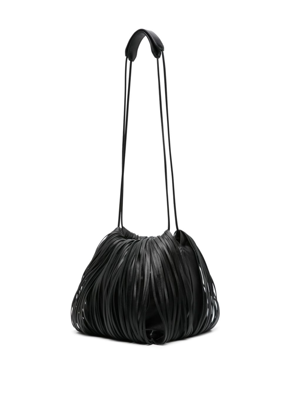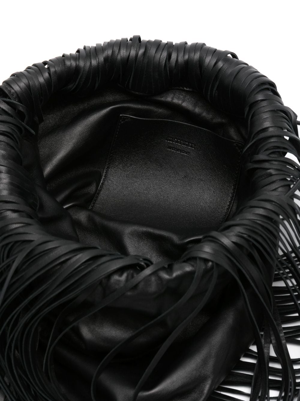 black calf leather smooth grain fringe detailing bucket body drawstring fastening two flat shoulder straps main compartment debossed internal logo internal slip pocket leather lining This piece comes complete with a protective dust bag.