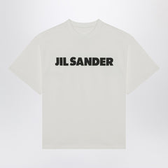 T-shirt in white cotton by Jil Sander, featuring wide short sleeves and a contrasting logo print on the chest.