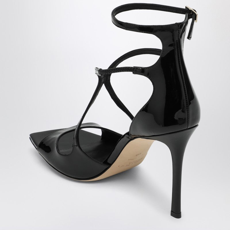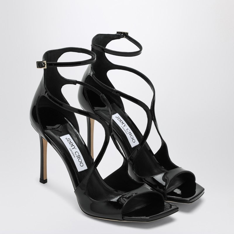 Black shiny leather and textile sandal from Jimmy Choo featuring an open square toe, a strappy upper, an adjustable ankle strap with buckle fastening and a leather sole.