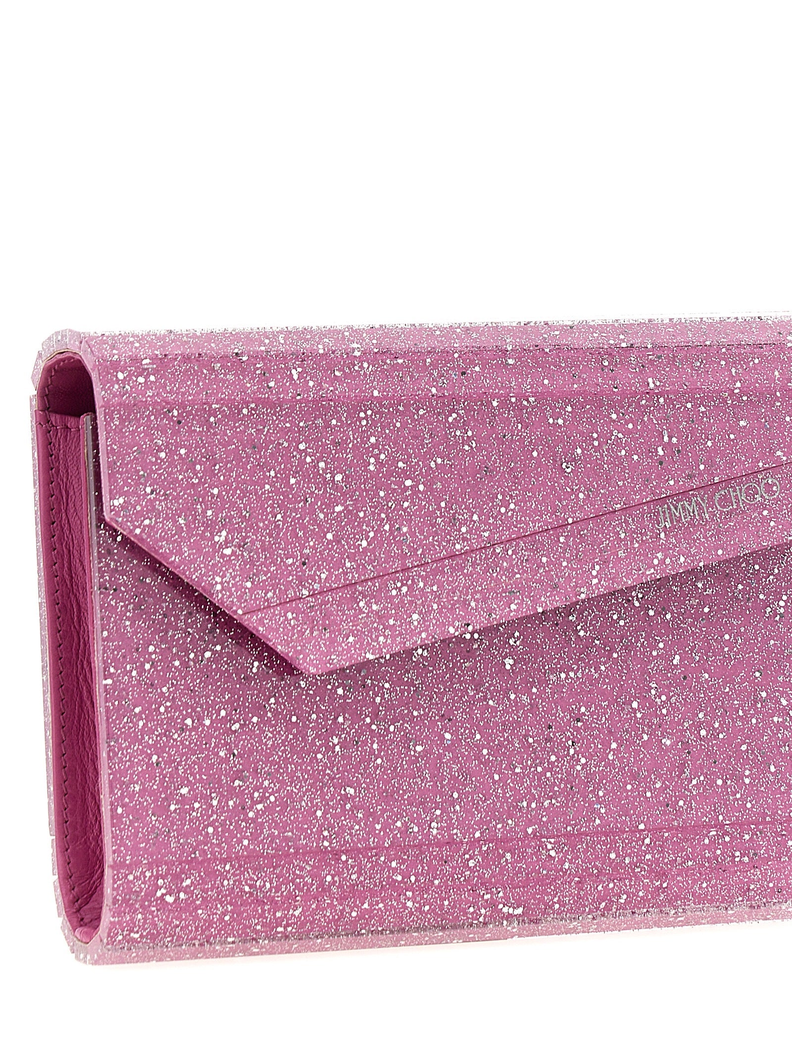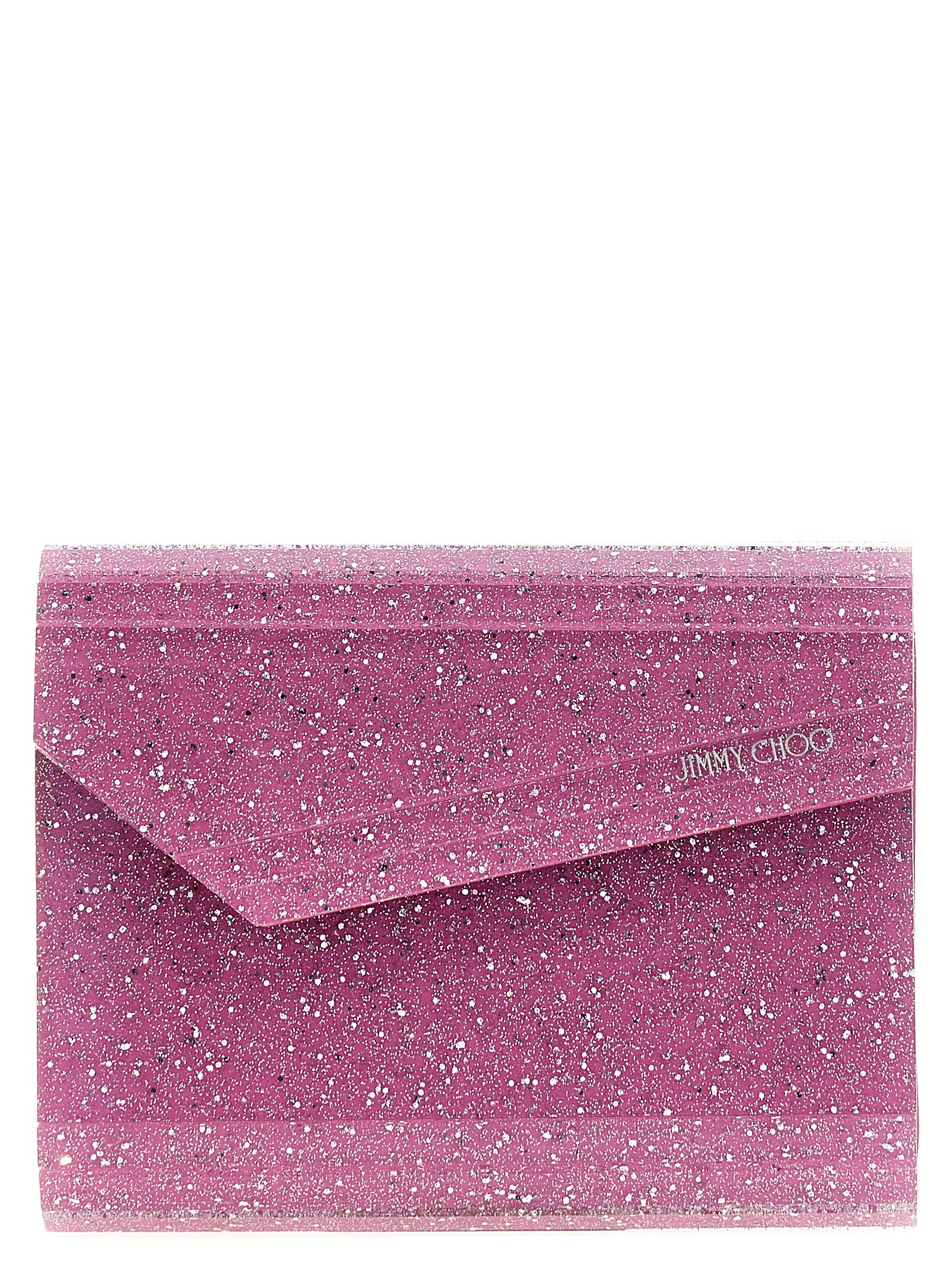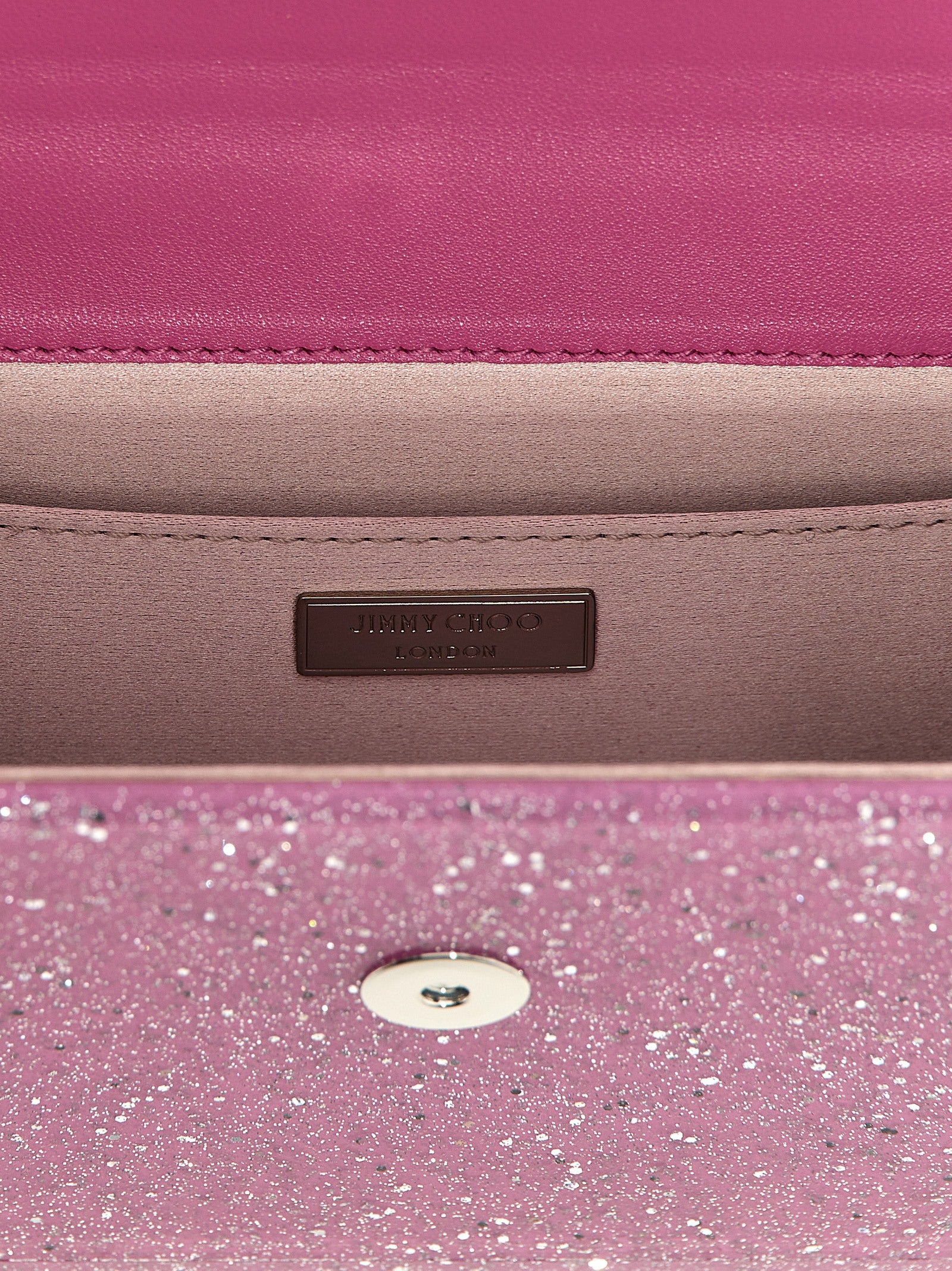 'Candy' clutch bag in dégradé glitter acrylic fabric, magnetic asymmetric flap closure, chain shoulder strap.