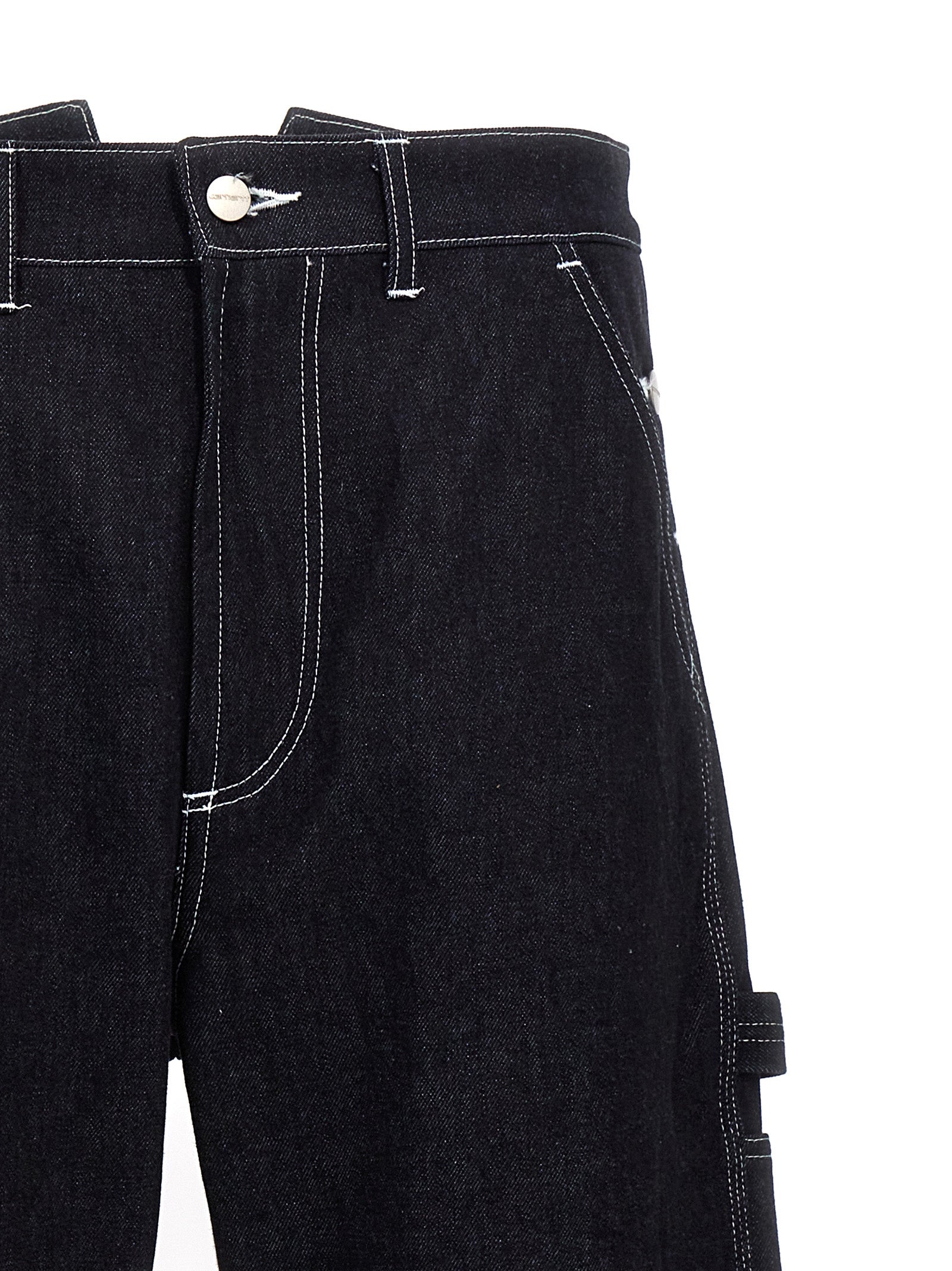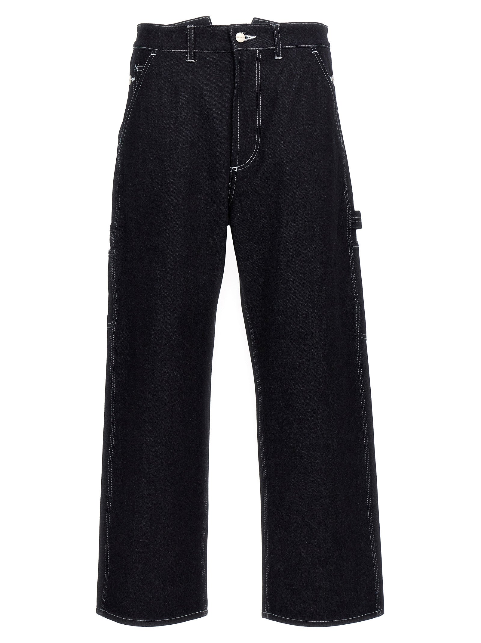 Junya Watanabe x Carhartt WIP cotton denim jeans with zip and button closure, pockets, back logo patch, and back slit detail at the waist.