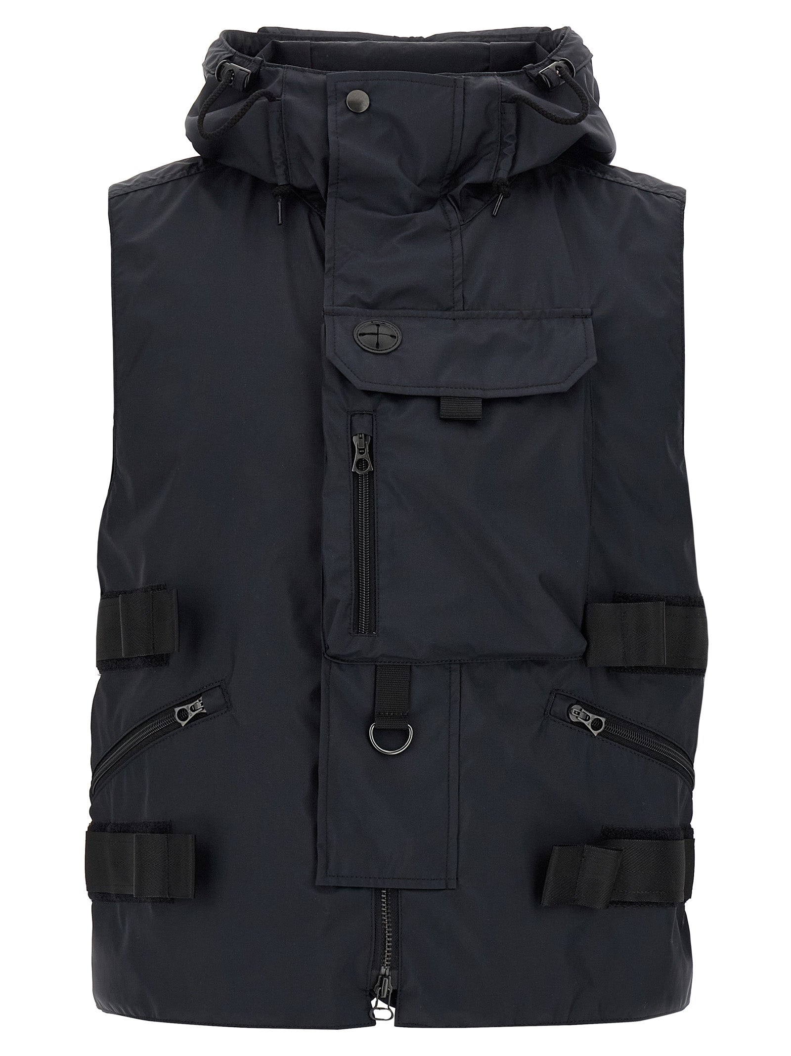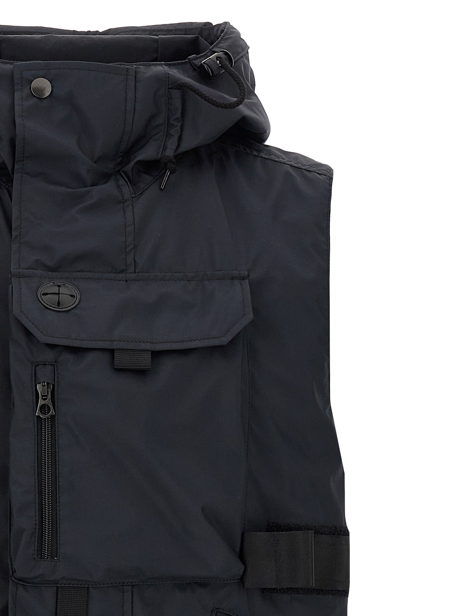 'Junya Watanabe MAN x C.P. Company' vest in technical fabric, double, with removable slightly padded and quilted lining, lens detail on the hood, zip closure.