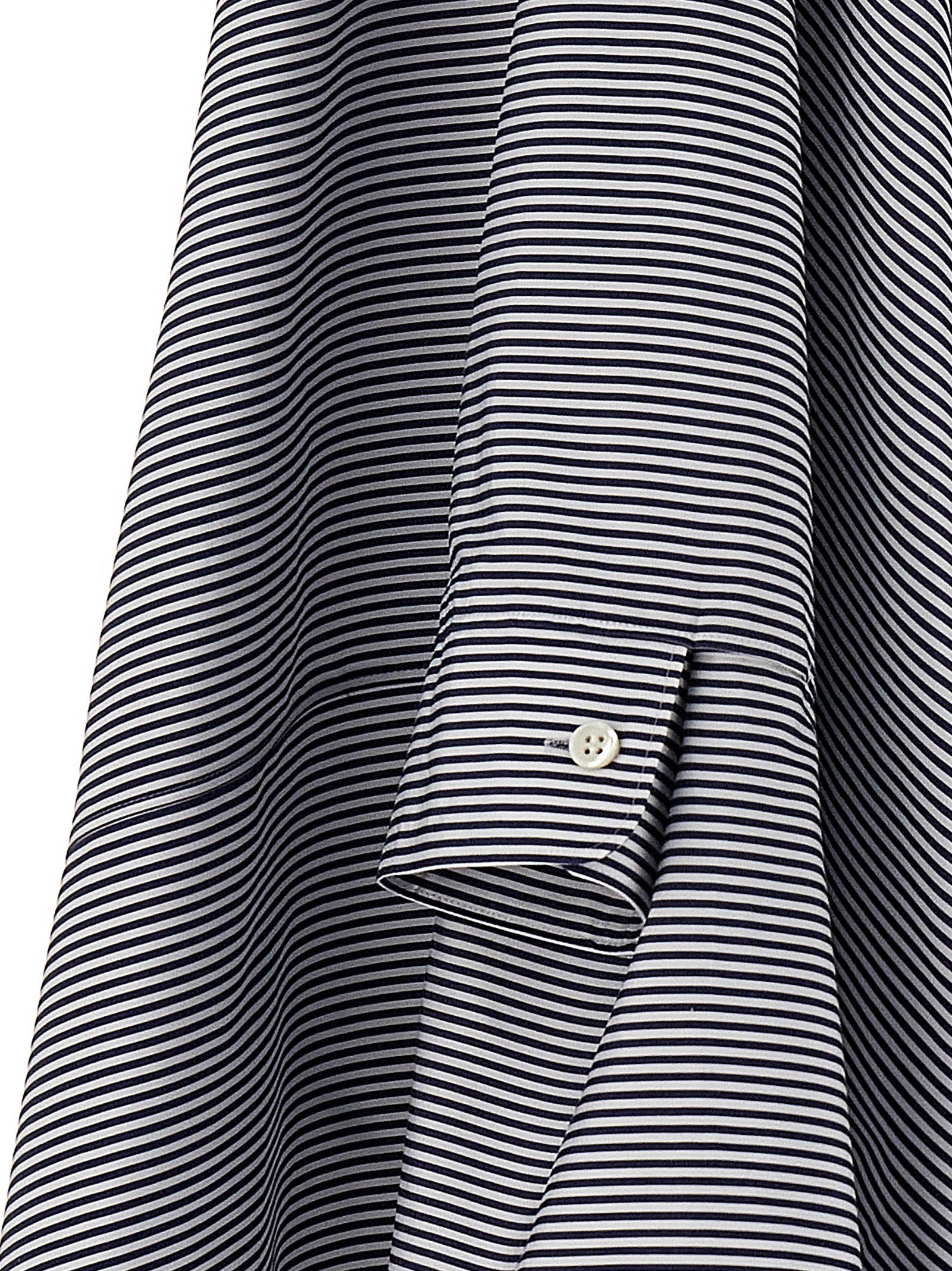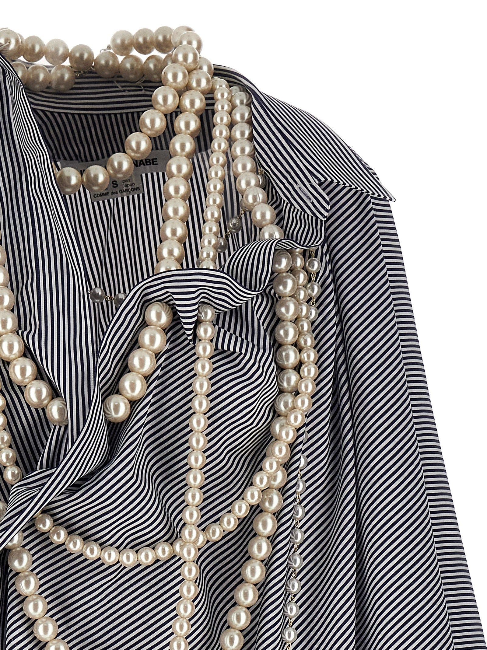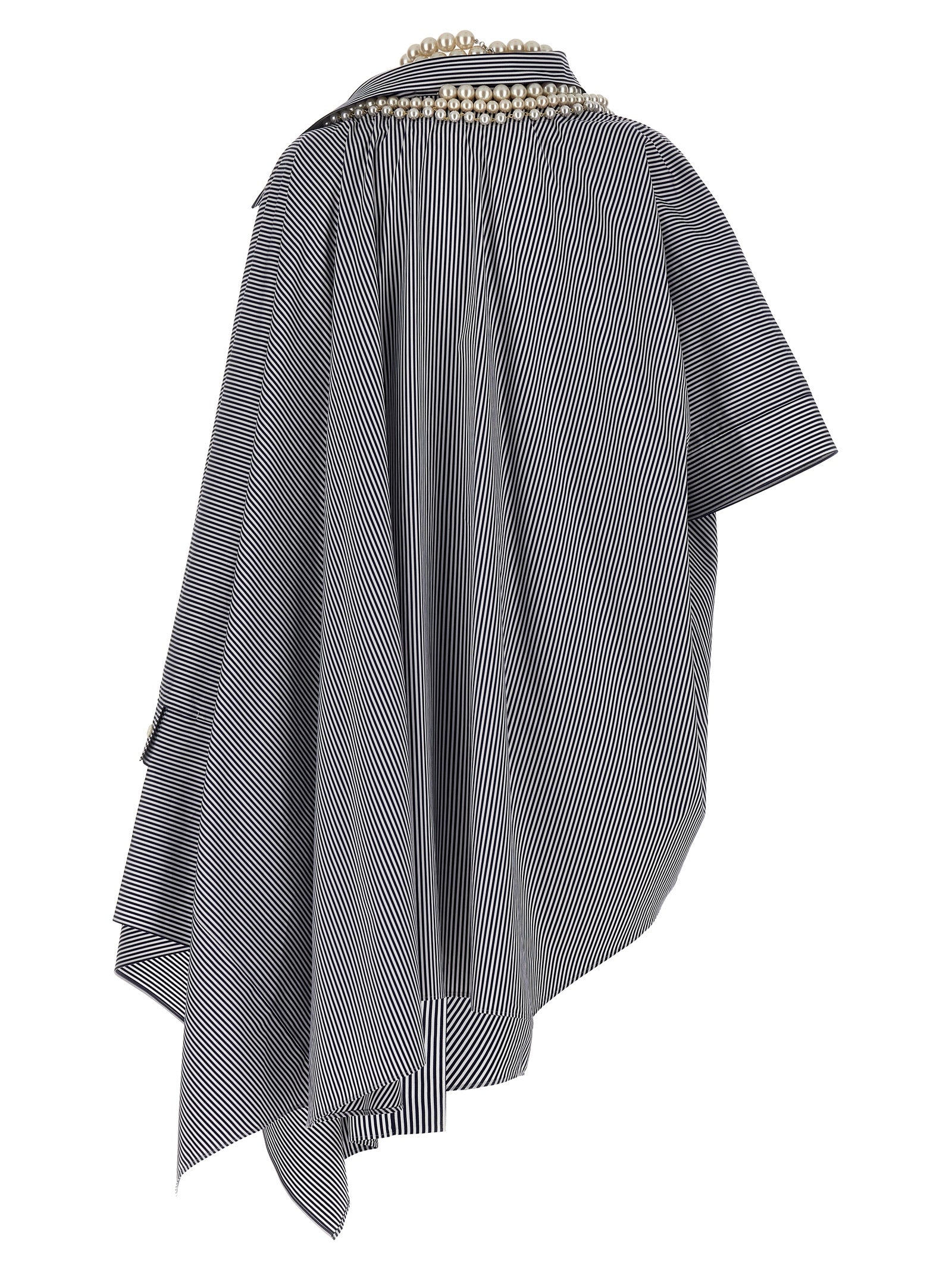 Oversize striped cotton shirt with pearl necklace appliqués, asymmetric style and wide sleeves.