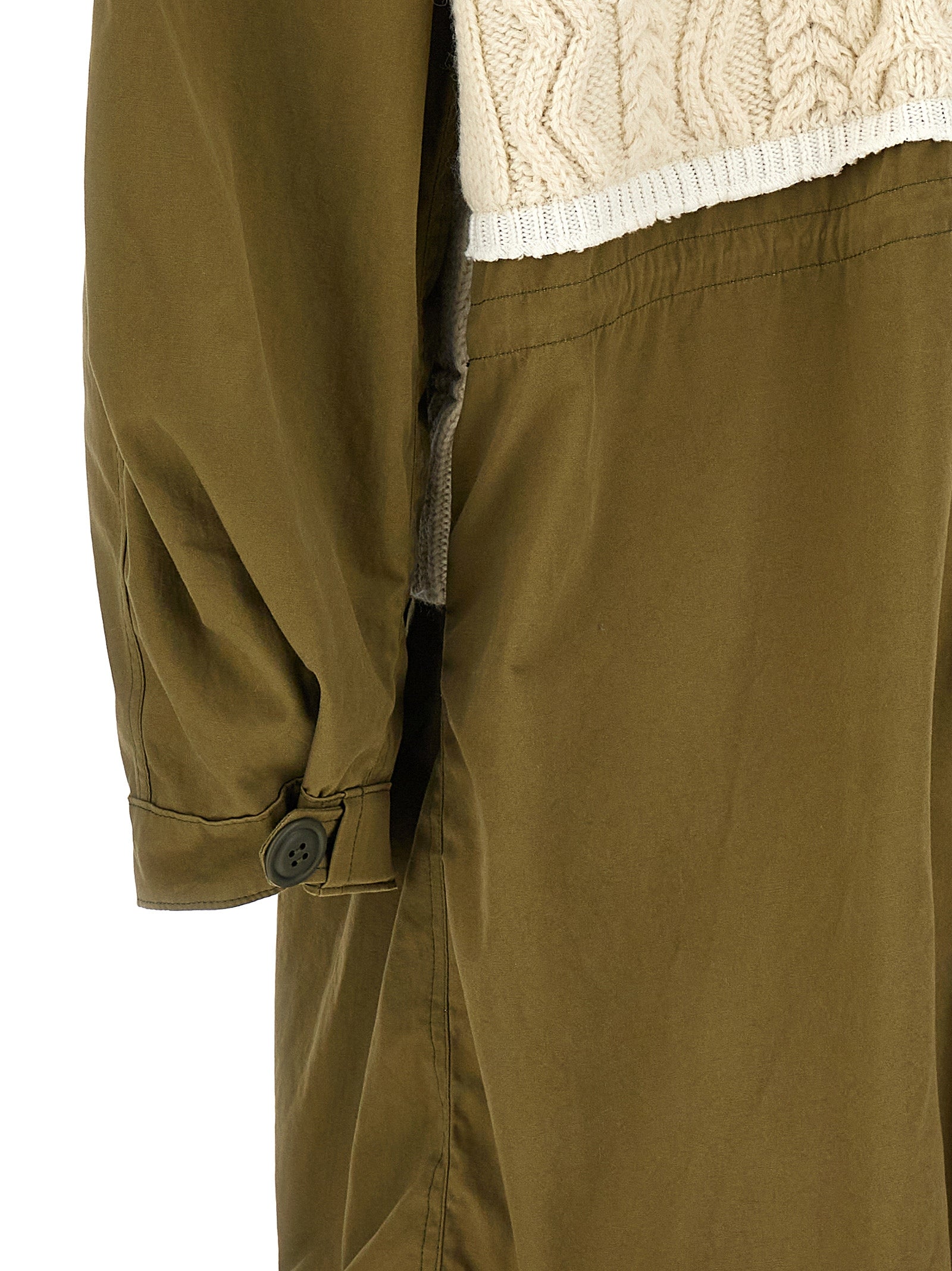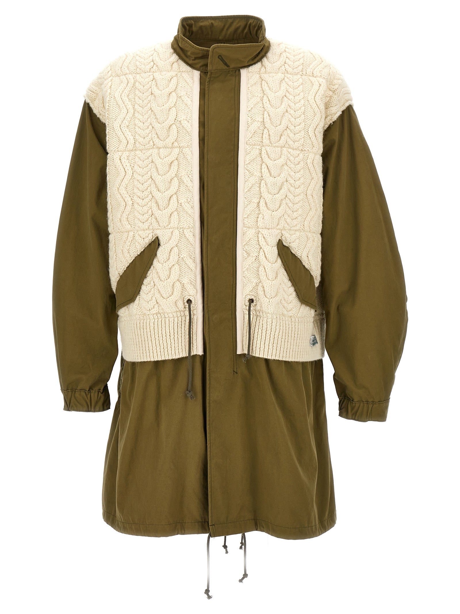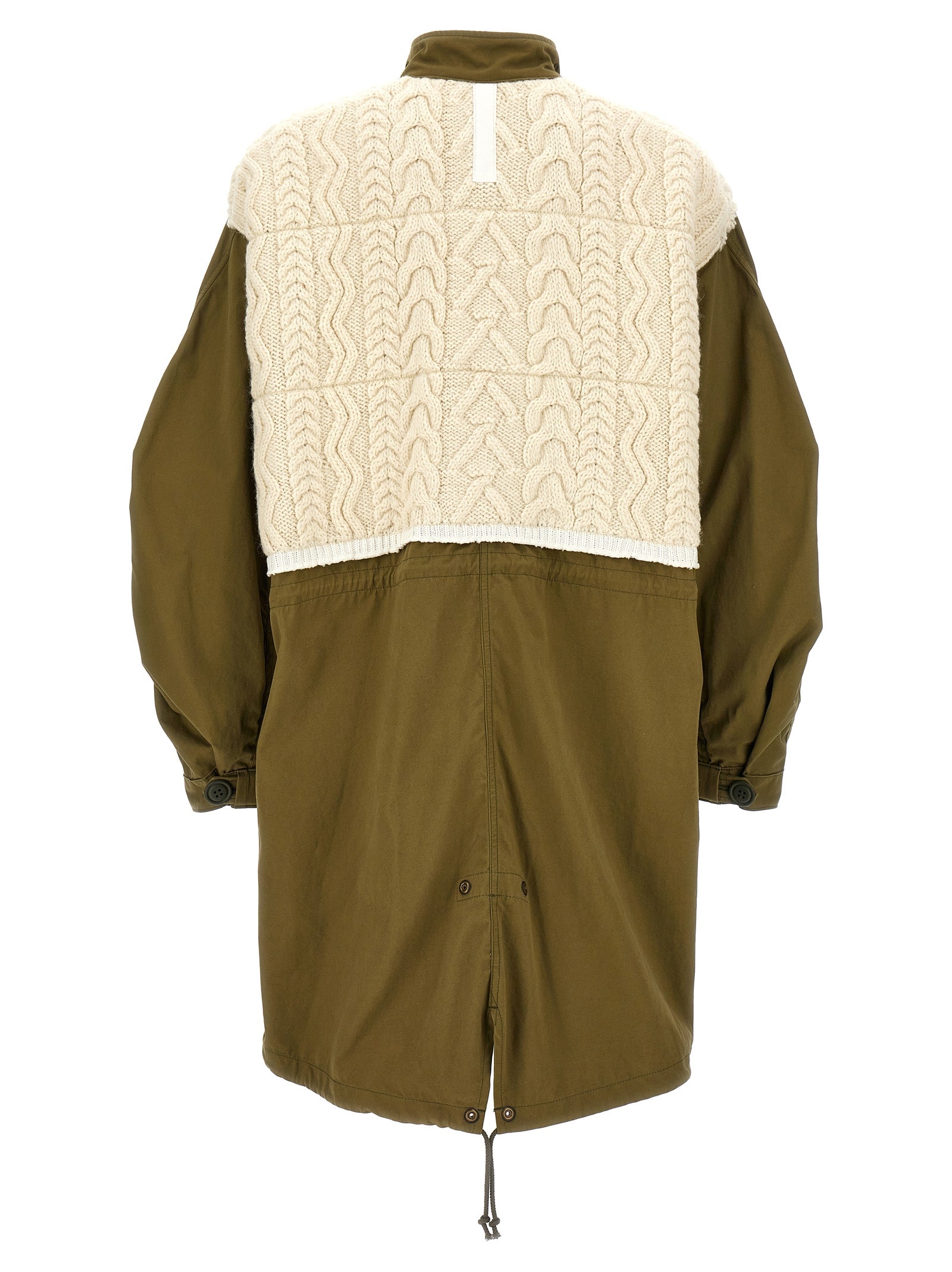 Long cotton parka with contrast wool knit inserts, zip and button closure, pockets, adjustable drawstring at the waist and on the hem, long sleeves with elastic cuffs.