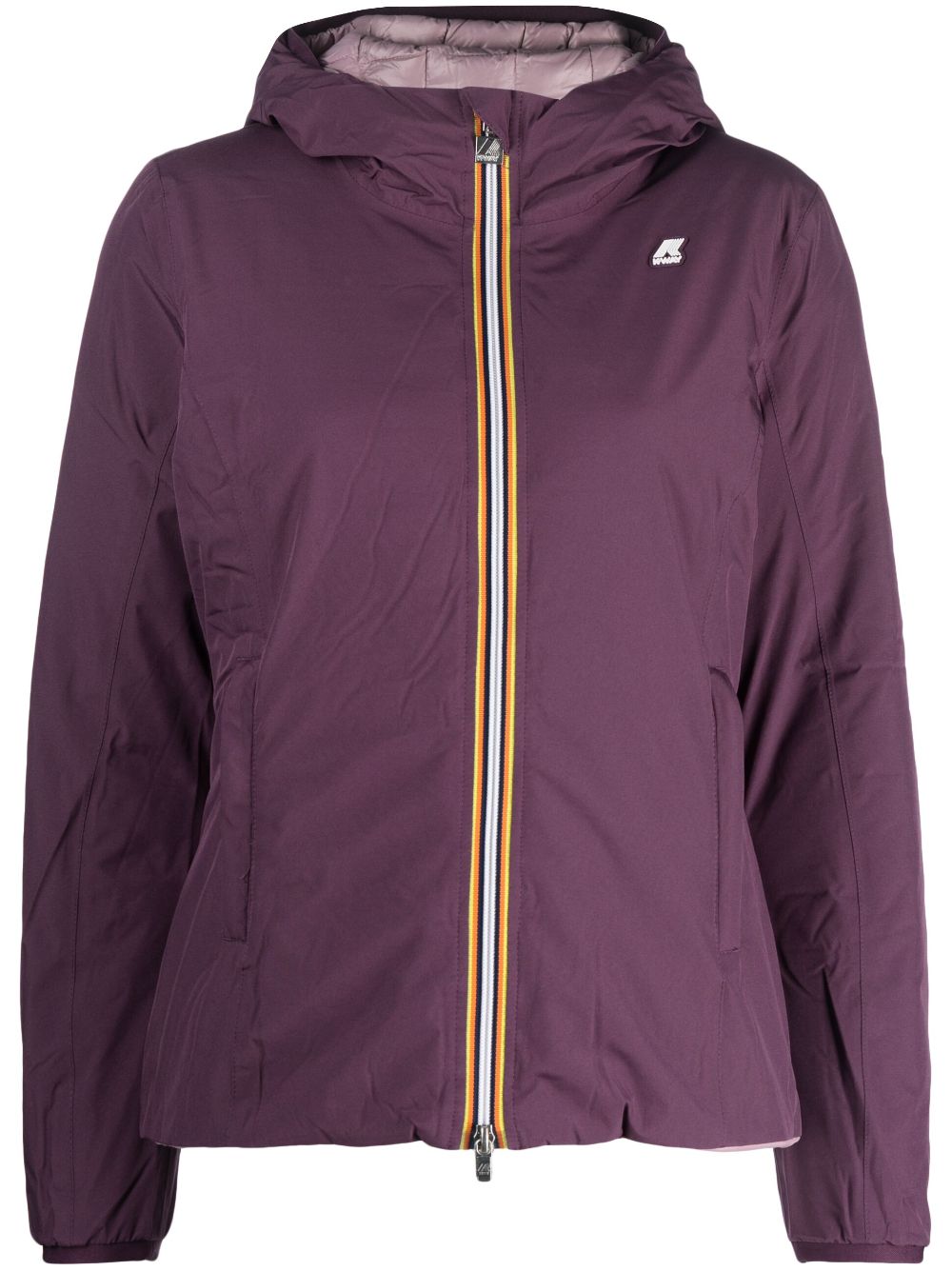 hooded puffer jacket from K-Way R&D featuring violet purple, down-feather filling, padded design, logo patch at the chest, classic hood, front two-way zip fastening, long sleeves, elasticated cuffs, two front welt pockets and straight hem.