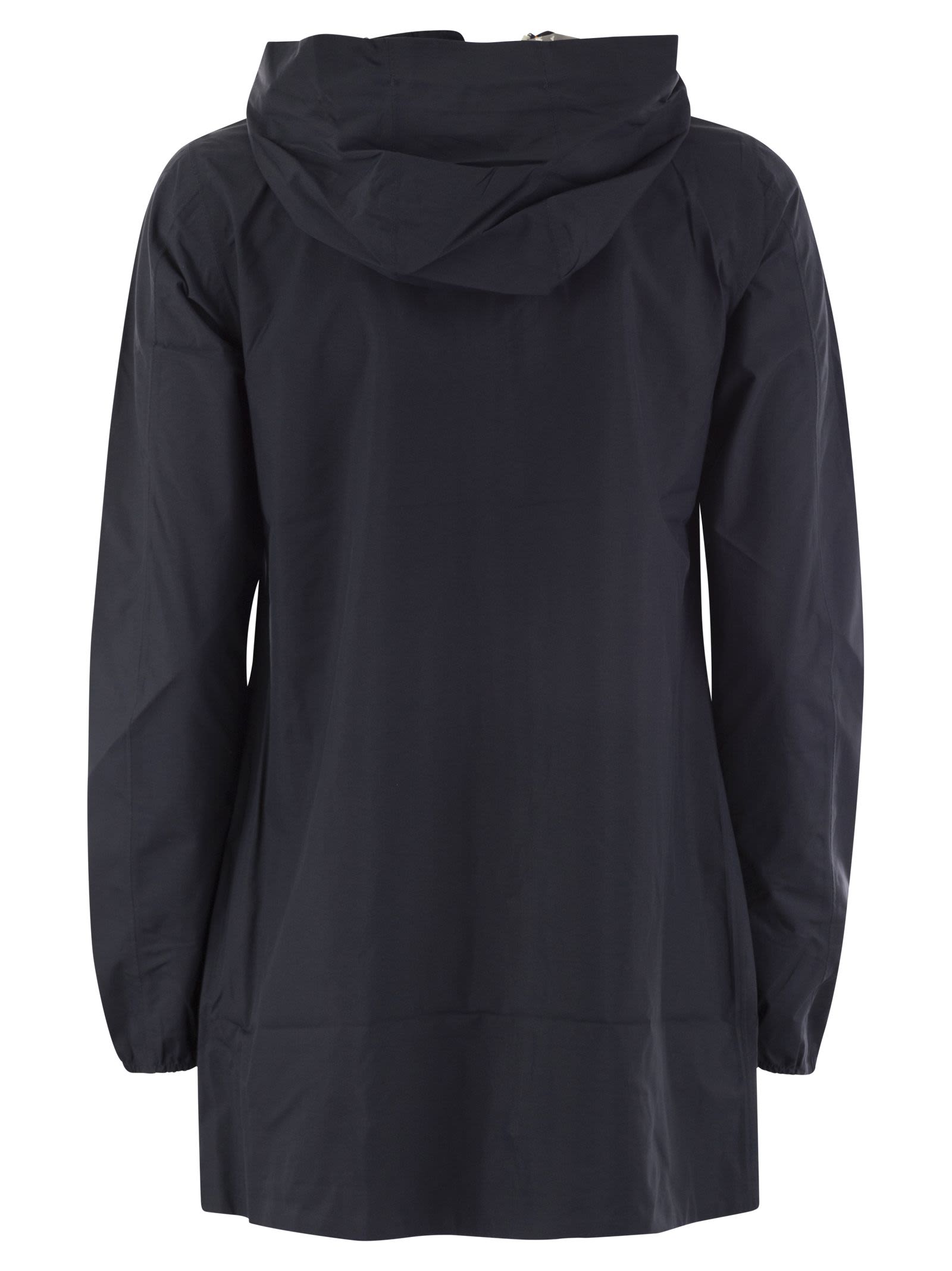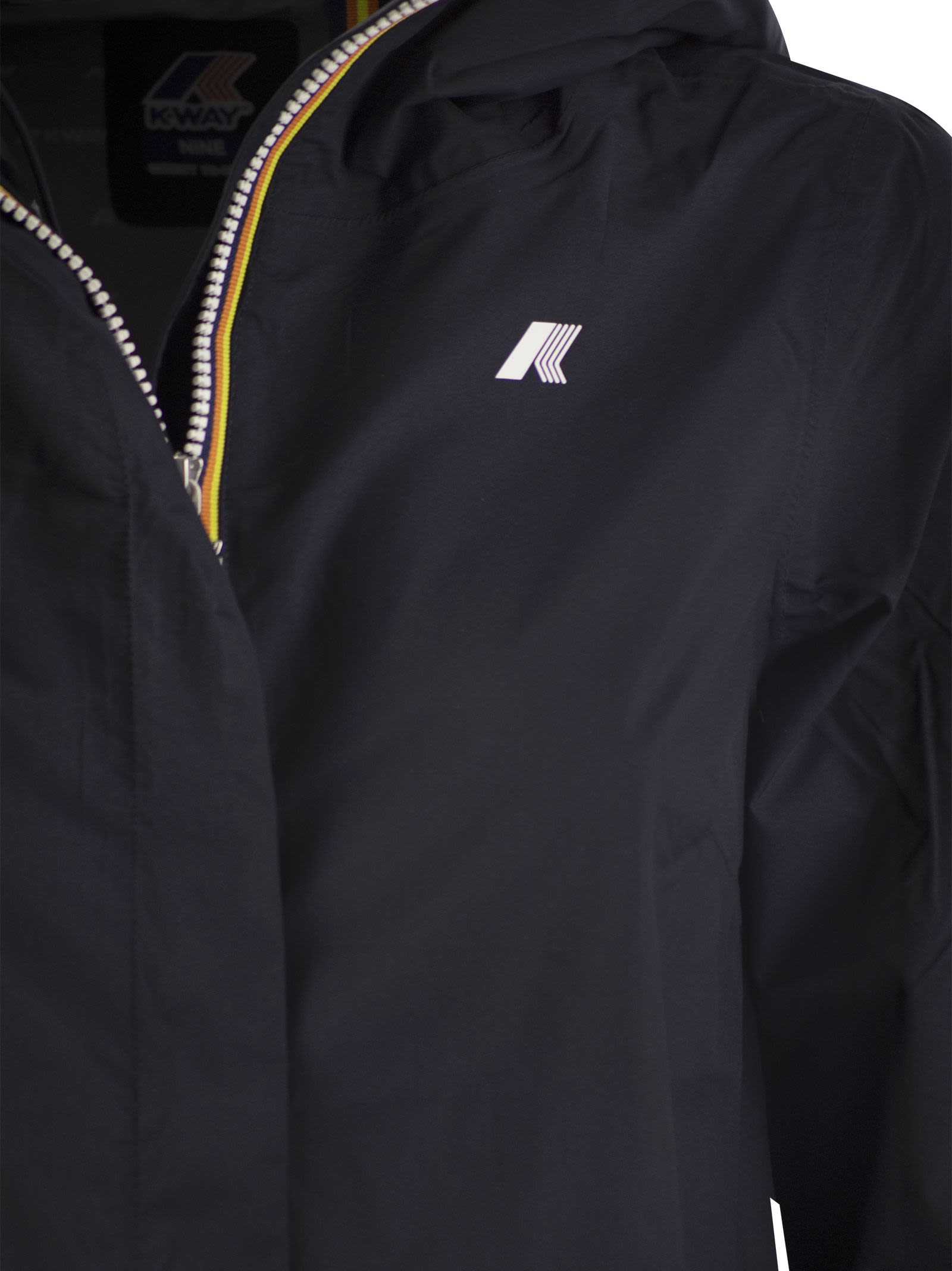 Sophie is a three-quarter length women's jacket with a slim fit, ideal for mid-season. It is made of recycled stretch technical fabric that follows your movements and protects against wind and rain up to 5000 water columns. The interior is lined with an insulating membrane decorated with K-Way lettering printed all over in a silver tone. Zipped side pockets, a wrap-around hood and cuffs with elastic inserts are functional details that ensure a snug and comfortable fit. - Stretch recycled polyester fabric, waterproof, water-repellent, windproof, breathable - Logo-printed inner membrane - Taped seams - Adjustable hood with elastic cord - Zip closure - Elasticated cuffs - 2 zipped pockets - Regular fit - White printed logo DESIGNER ID: K5127NW K89
