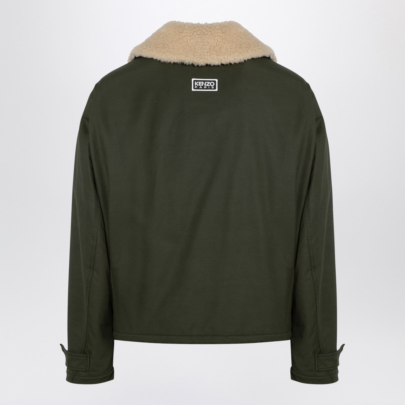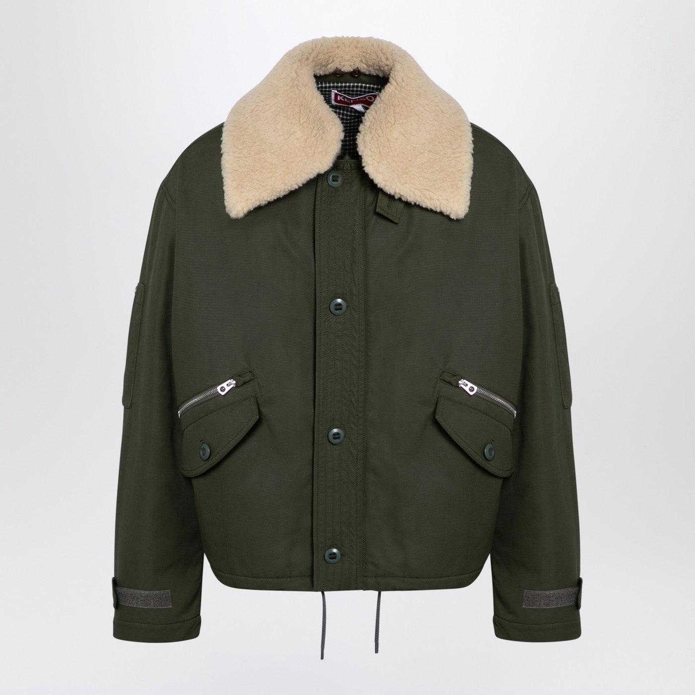 Khaki-coloured cotton blend bomber jacket from Kenzo featuring a front zip and button fastening, long sleeves with a pocket and Velcro cuffs, a removable classic fleece collar, a drawstring at the hem, front flap and zipped pockets, a back logo patch and a boxy fit.