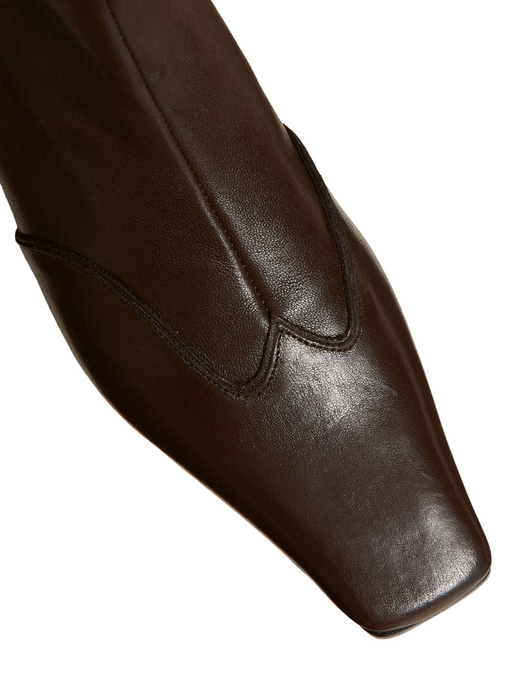 A mid-calf urban cowboy boot with a square toe and a stylized toe traced with tone-on-tone stitching. Side zipper closure ensures a smooth fit.