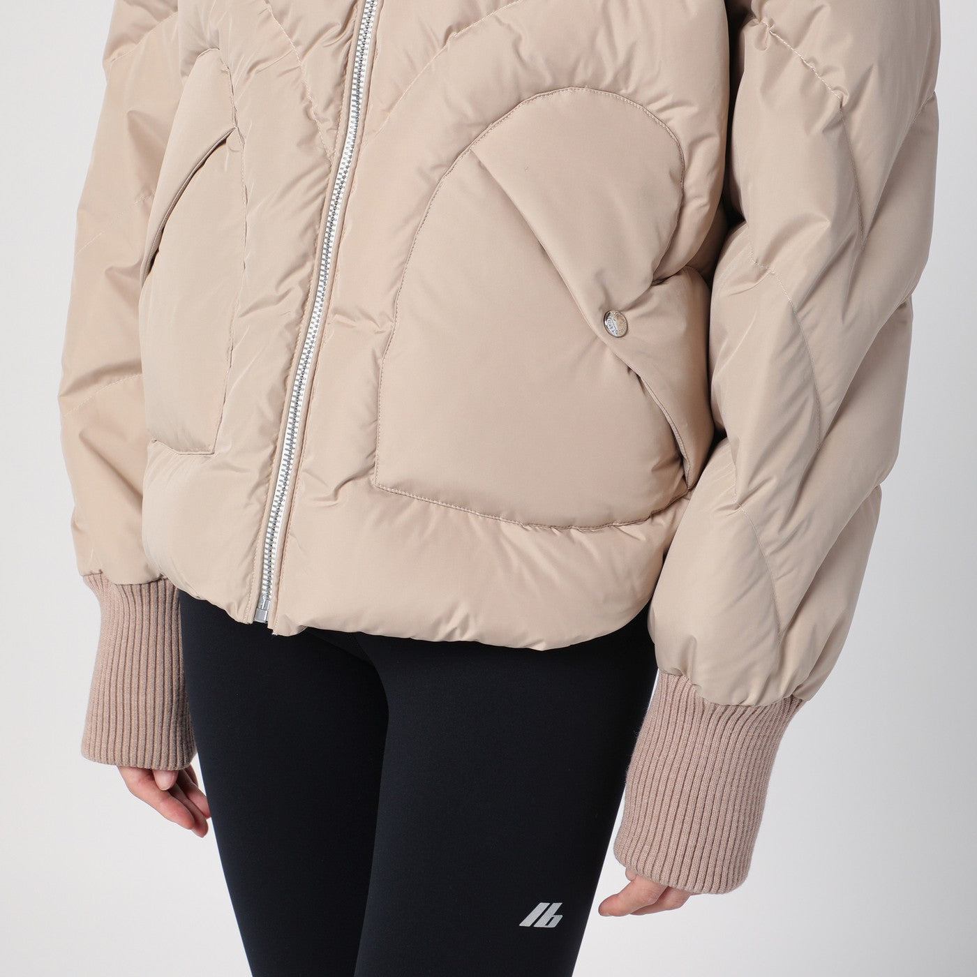 Beige padded jacket from Khrisjoy, featuring long sleeves with ribbed knit cuffs, front zip fastening, high collar, two snap button pockets on the front and quilted heart-shaped design.