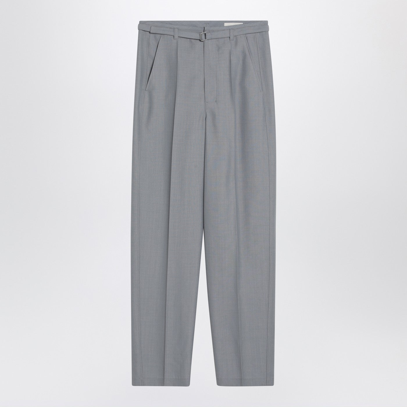 Lemaire pants in grey mélange wool blend, featuring two side welt pockets, one welt pocket on the back with a button, straight cut design with front pleat, removable belt with metal adjuster, zip fly, and belt loops.