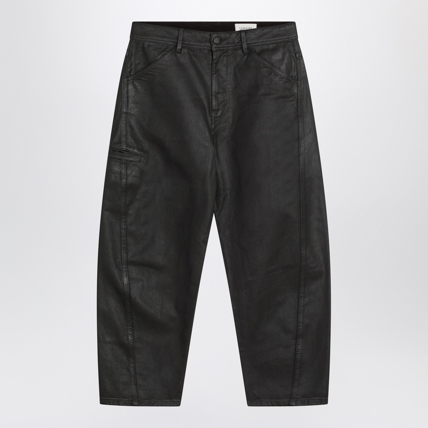 Lemaire chocolate brown shiny cotton denim pants, featuring a front zip and button closure, belt loops, two welt pockets, two patch pockets on the back, and a side welt pocket.