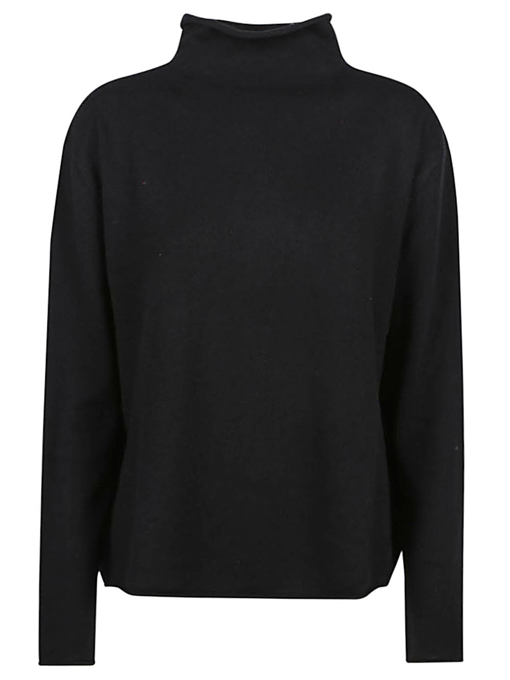 Sweater with straight fit, low shoulders and mock neck with raw hem.