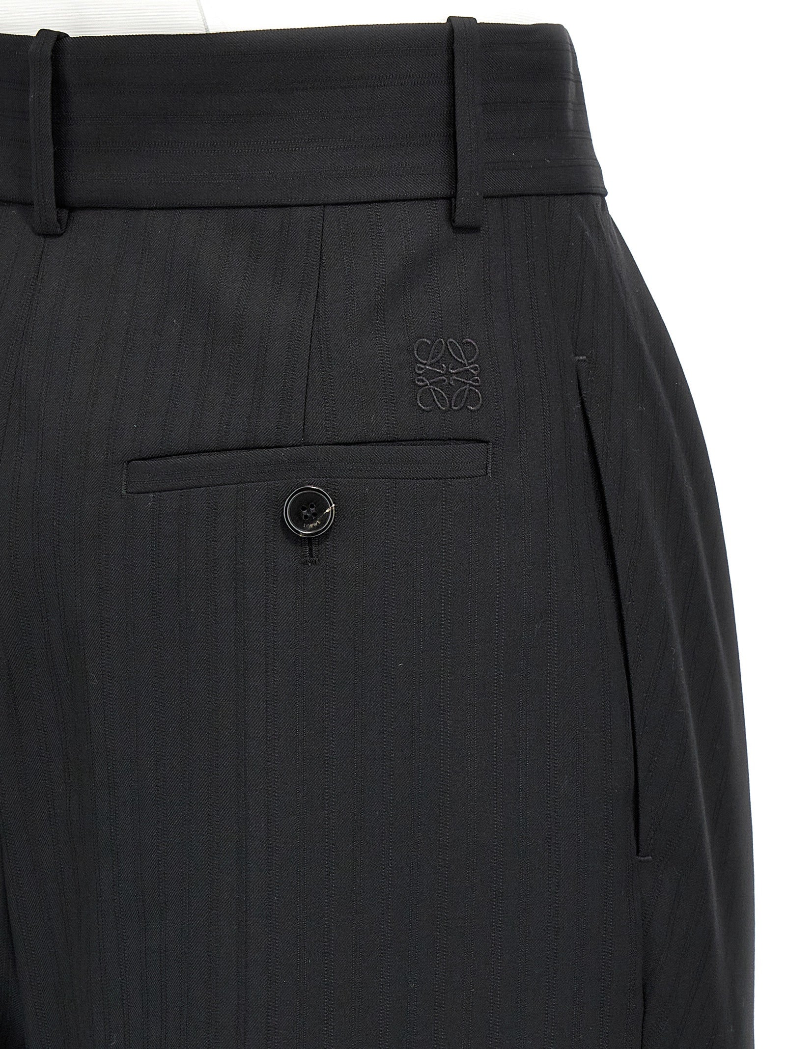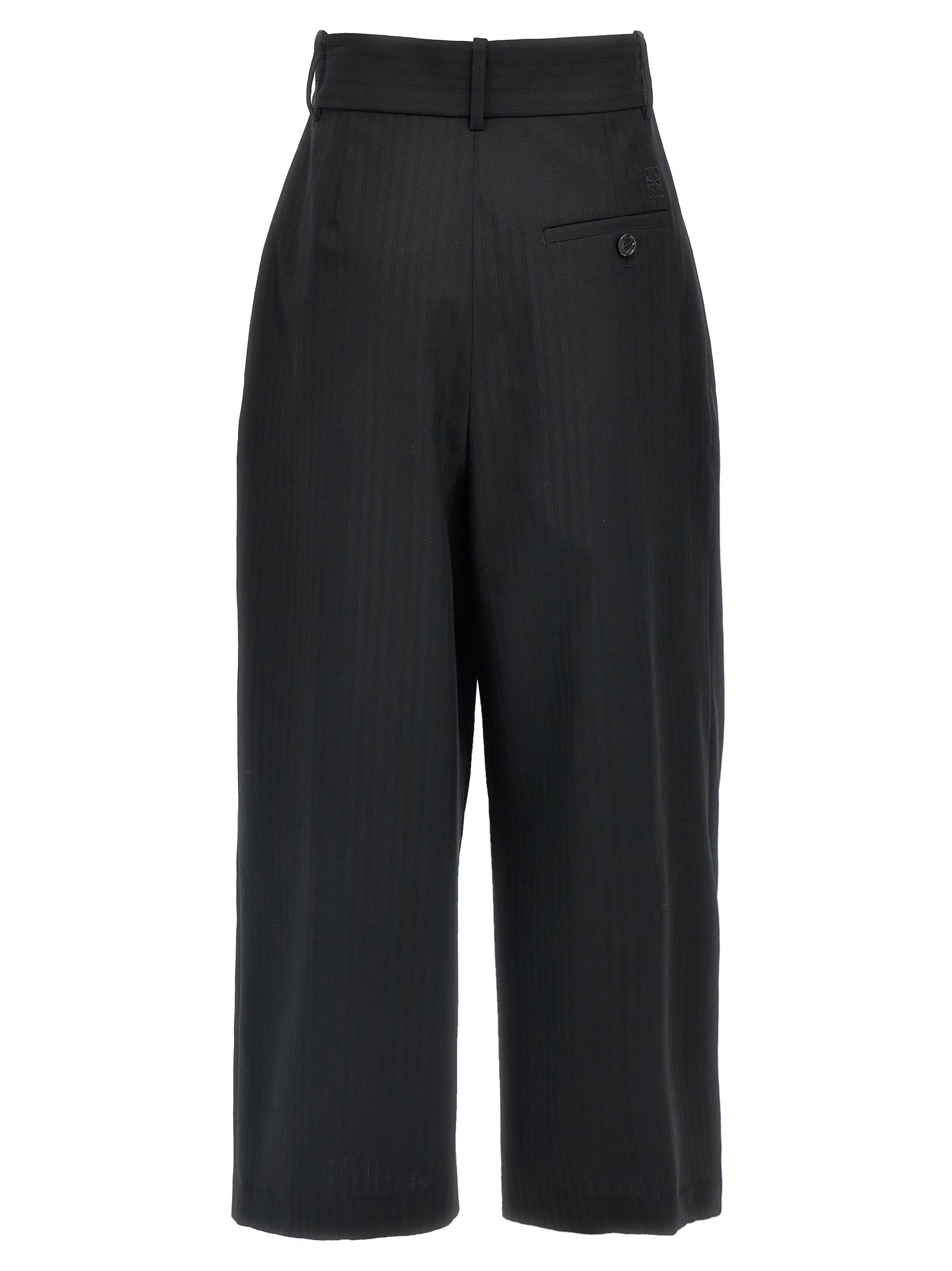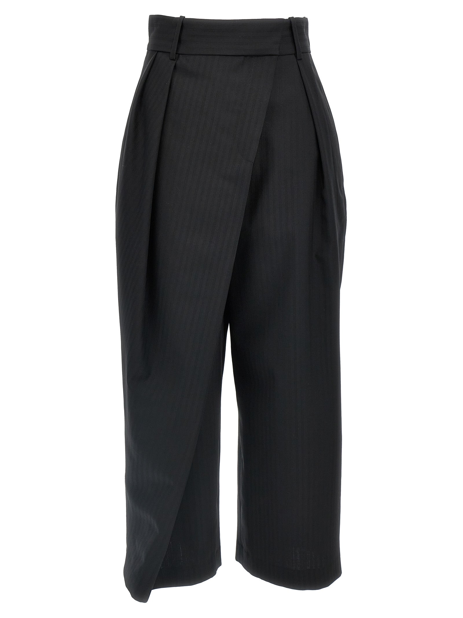 'Cropped Wrap' striped wool pants, back Anagram embroidery, high-waisted cropped style, wide leg, low crotch, zip and button closure, wrap closure with overlapping hooks, pockets.