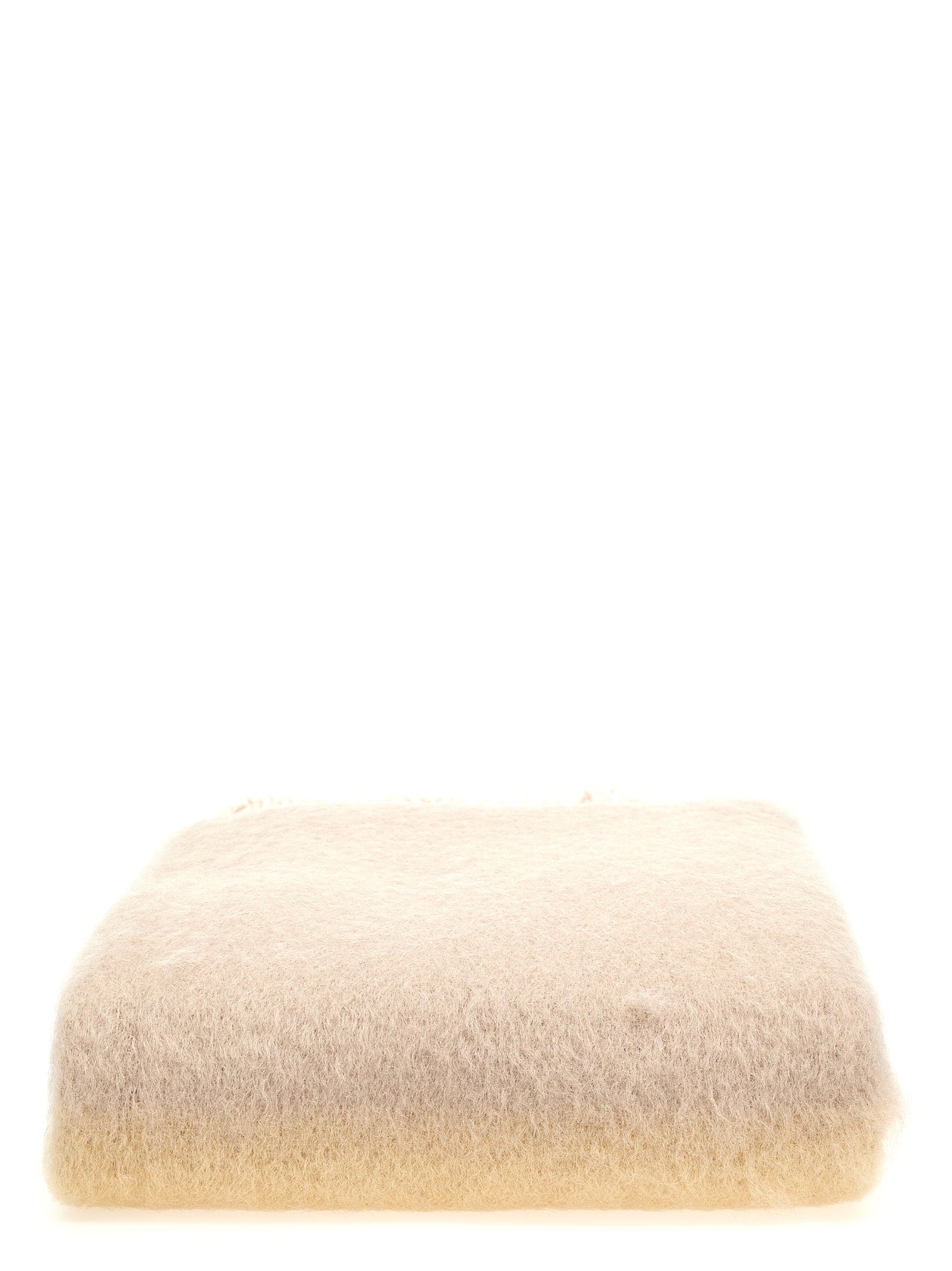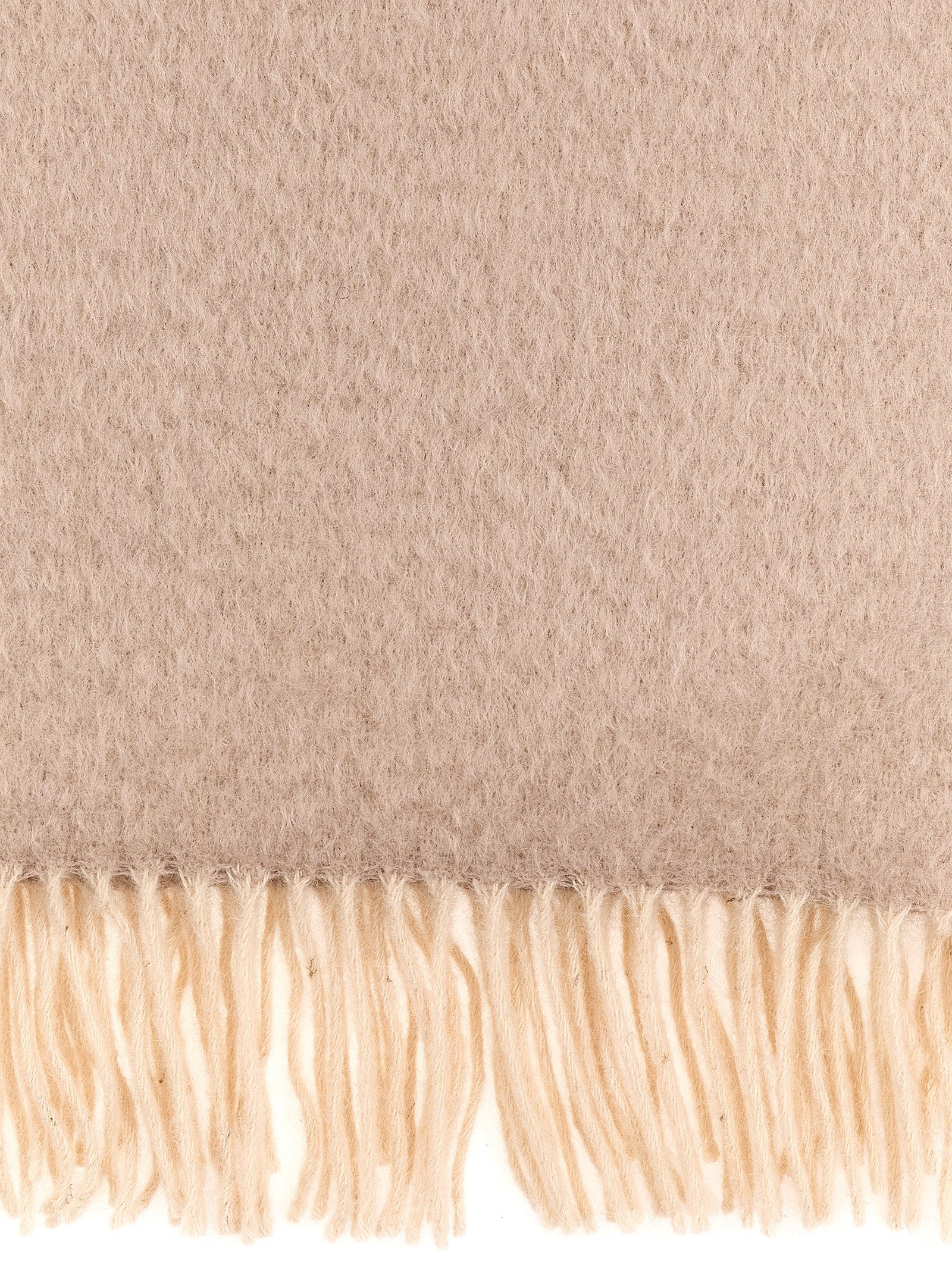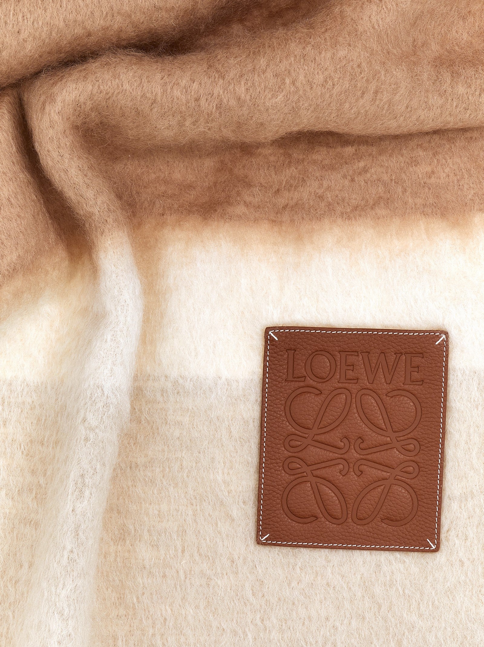 Multicolor mohair and wool blanket with leather logo patch and fringes at the edges.