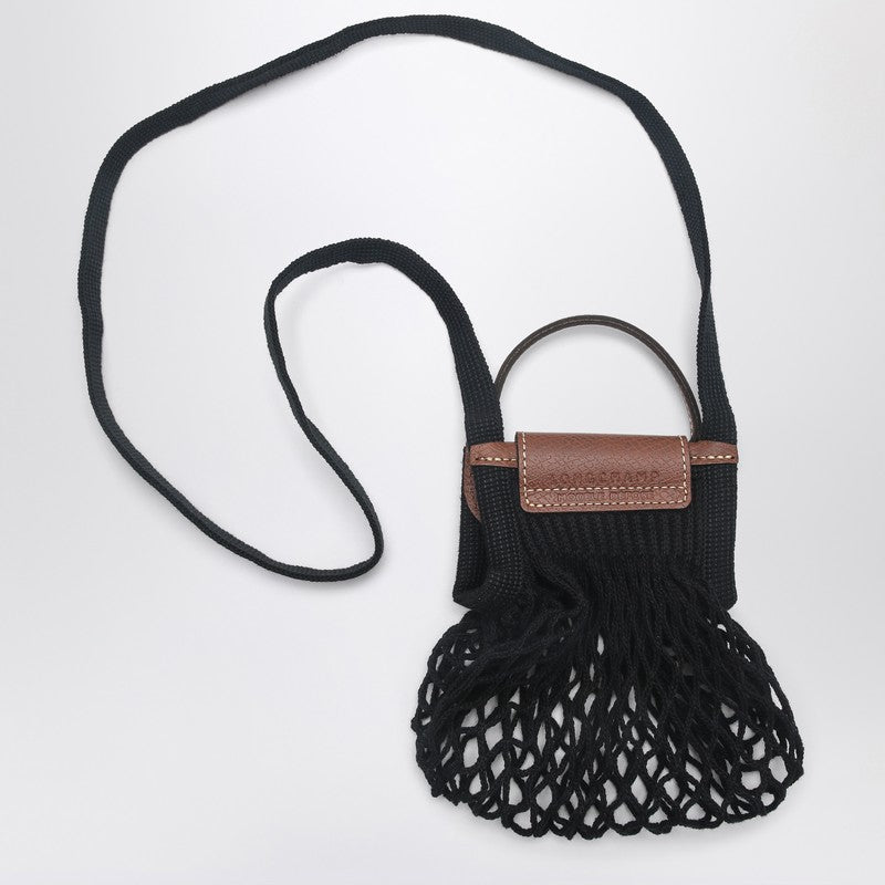 Black cotton minibag from Longchamp, featuring an openwork mesh design, two top handles, a flap and press stud fastening and leather details.